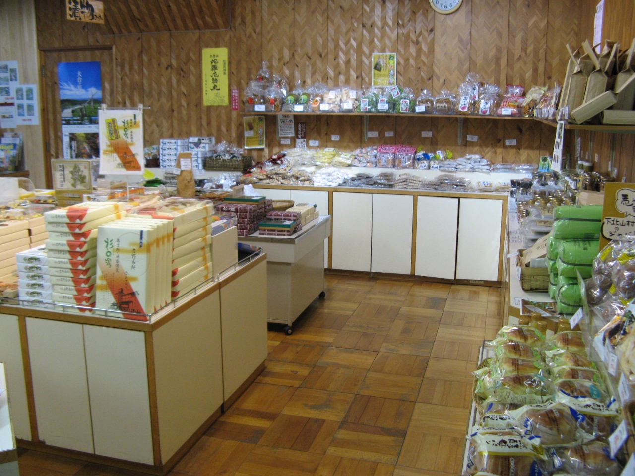 道の駅から歩いて5分もかからないところに伊勢神宮内宮の別宮である瀧原宮があり、駐車場に車を停めて、てくてく歩いて参拝したり、その後、休憩や食事をとったりするのに都合の良いところです。建物は名前の通り木製の大きな造りになっていて、館内には、家具やまな板、置物など木工品や工芸品のほか、この辺りでは有名な大内山牛乳の製品、魚の甘露煮、お菓子など大紀町特産品が販売されています。隣の建物には、野菜や果物などの直販コーナーやコンビニもあり、使い勝手の良い道の駅だと思いました。