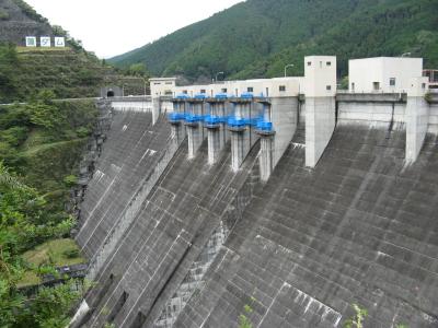 発電を目的とした、堤高60m、堤頂長200.8mの重力式アーチダムです。上流の“池原ダム”との間で揚水発電を行っていて、下流調整池の役割を担っています。