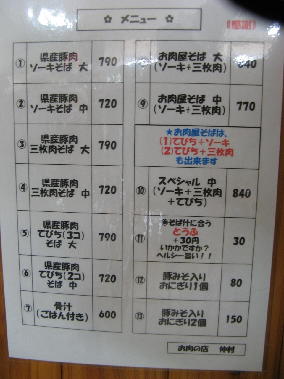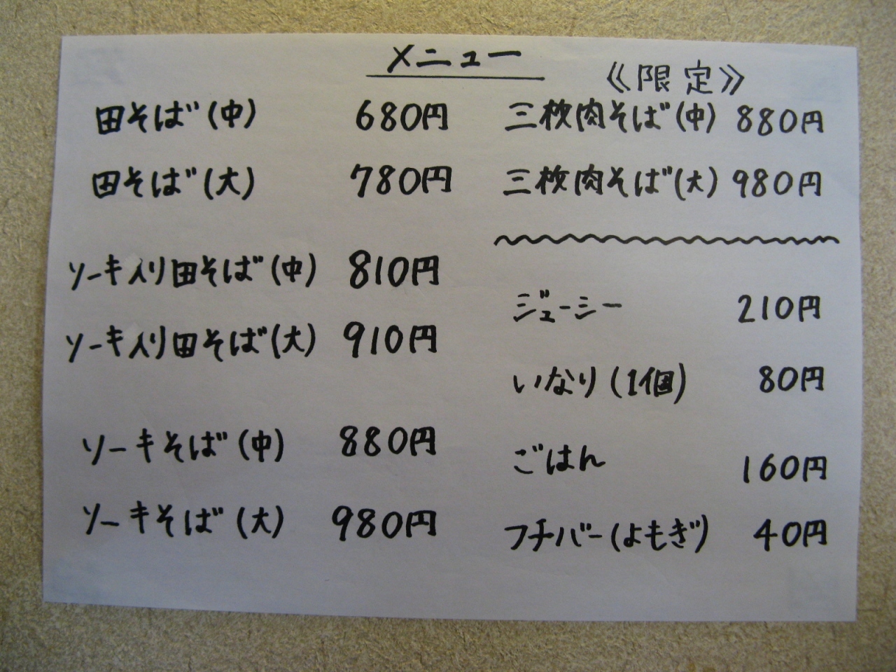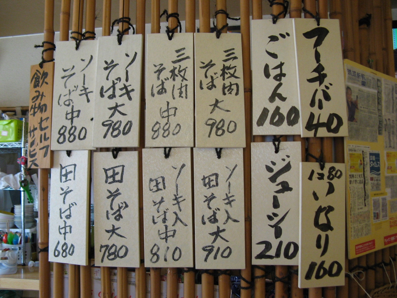 メニューはソーキそば、三枚肉そば、ソーキ入り田そば、田そばの4種類(大・小あり)のそばと、ご飯、ジューシー、いなり、フーチバだけで、いたってシンプル。なお、そばの大・小は、麺の量が異なるだけとのこと。