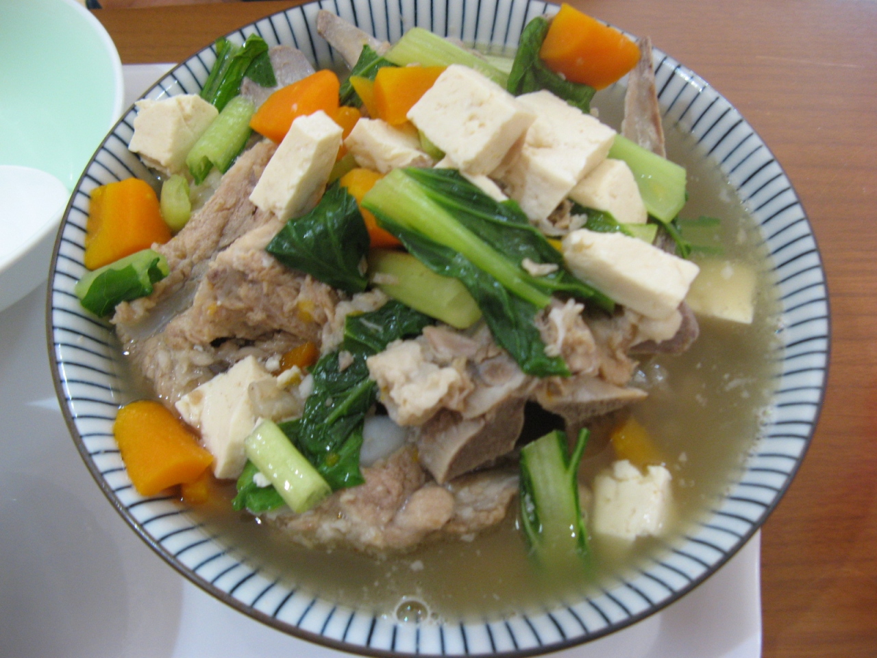 1日限定5食という“骨汁”は、肉片や軟骨がたくさんついた大量の骨片と豆腐、人参、青菜が入ったもので、出汁はあっさりした絶妙な味付けとなっていてたいへん美味しかった。ご飯に添えられていた豚味噌もなかなかいける味でした。