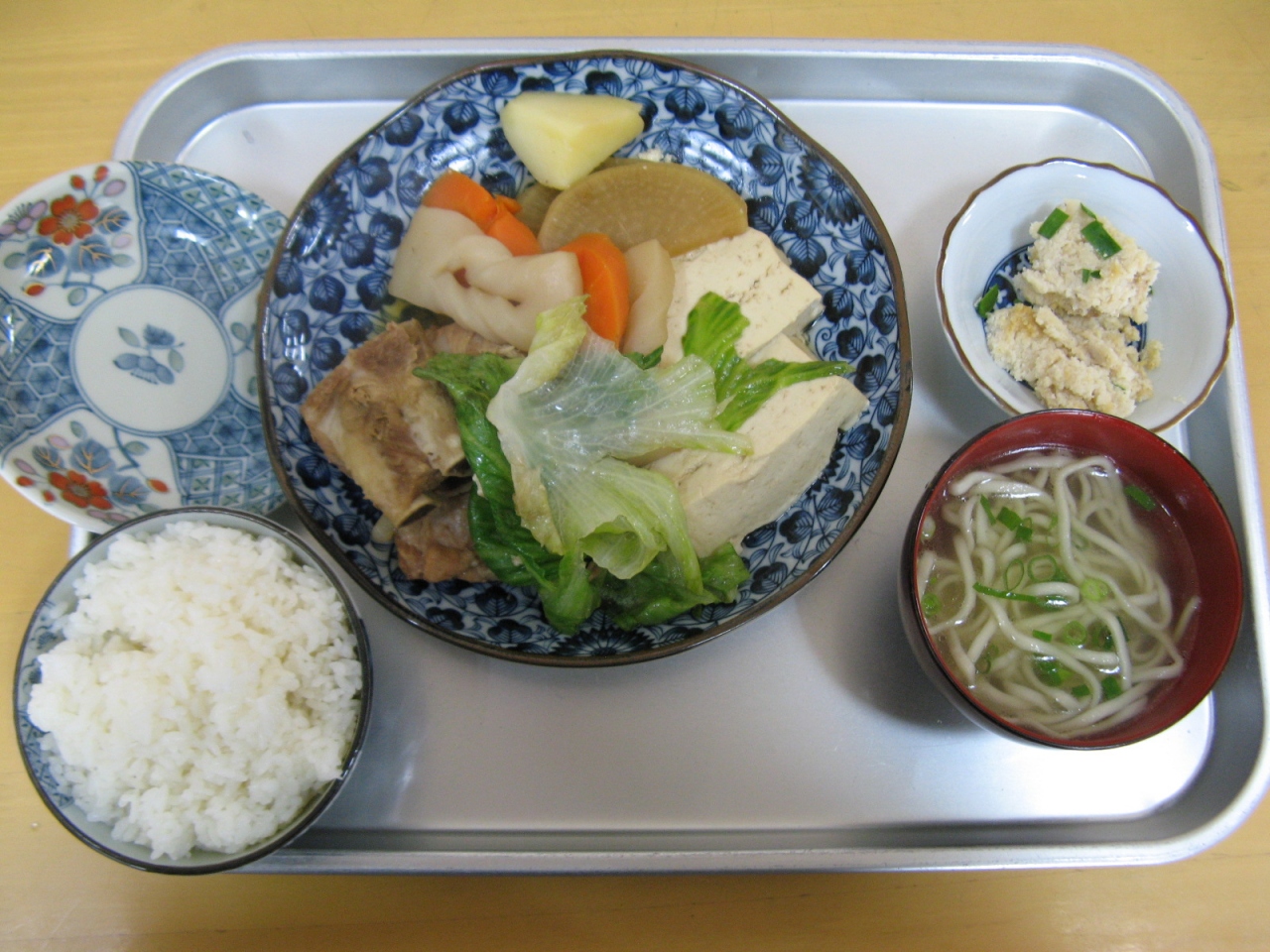 “ソーキ定食”の方は、小さめのソーキ3個と豆腐、人参、レタス、大根、蒟蒻を煮込んだもが乗った皿と、ご飯、おから、小さいそばがセットになっています。鰹節と豚骨の出汁はあっさりしていて美味しかったが、沖縄のこの種の食堂で、この値段で小さなソーキが3個とは、少し物足りない感じがしました。- 旅行時期