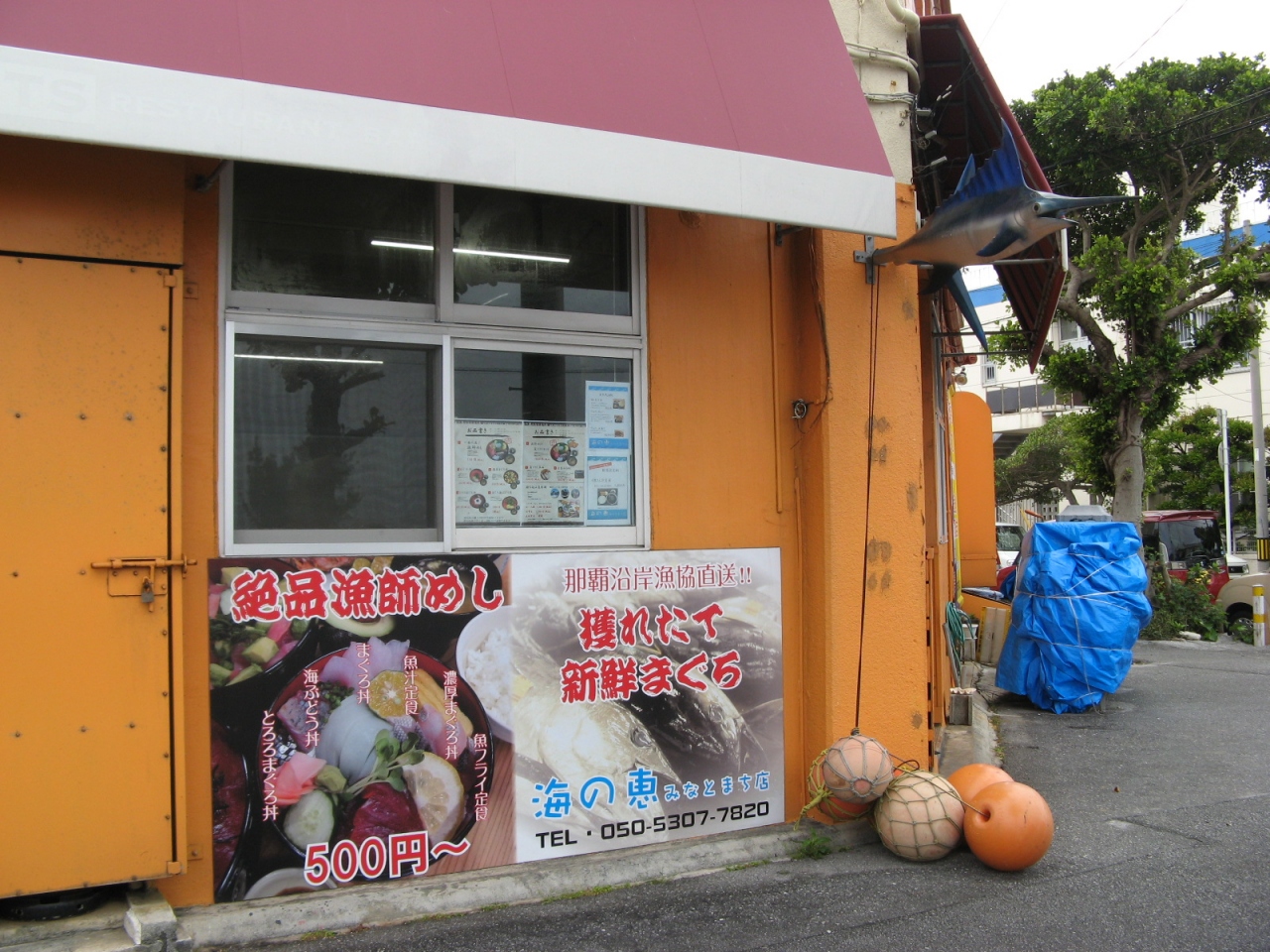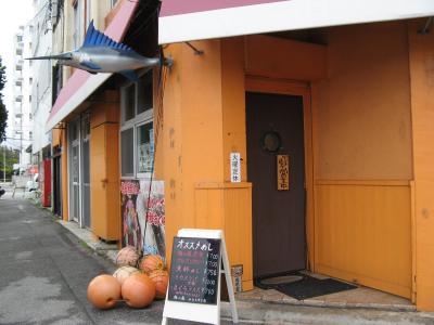 お店は、那覇市沿岸漁港入口すぐ前、小さなビルの角の一階、“かじきまぐろ”の看板が上がっています。駐車場は見た感じ無いようで、道路端に停めている様でした。