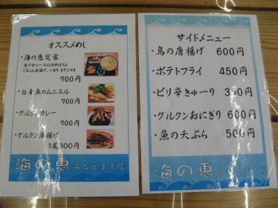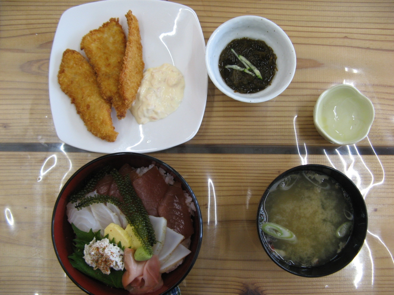 漁師めし(海鮮丼)の刺身はその日のおまかせだそうで、この日はマグロやイカ、白身魚が中心で、海ぶどうもついていました。魚のフライは白身魚のフライが3個にタルタルソースが添えられたもので、その他にもずく酢と魚汁が付いていました。