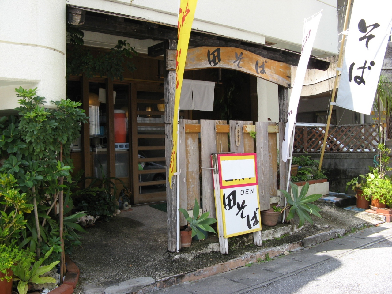 那覇市真嘉比の住宅街、大きな通りに面した2階建ての民家の1階に店舗があり、店の前には“田そば”、“沖縄そば”と書かれた大きな幟が目立ちます。駐車場は左隣のカフェとの間に専用の駐車場への入口があり、数台の車を停めることができます。