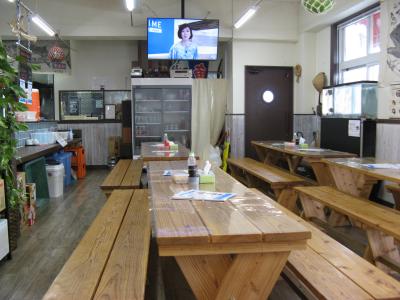 店内は木製のベンチとテーブルがずらりと並び、外観から感じたより広く、綺麗でした。