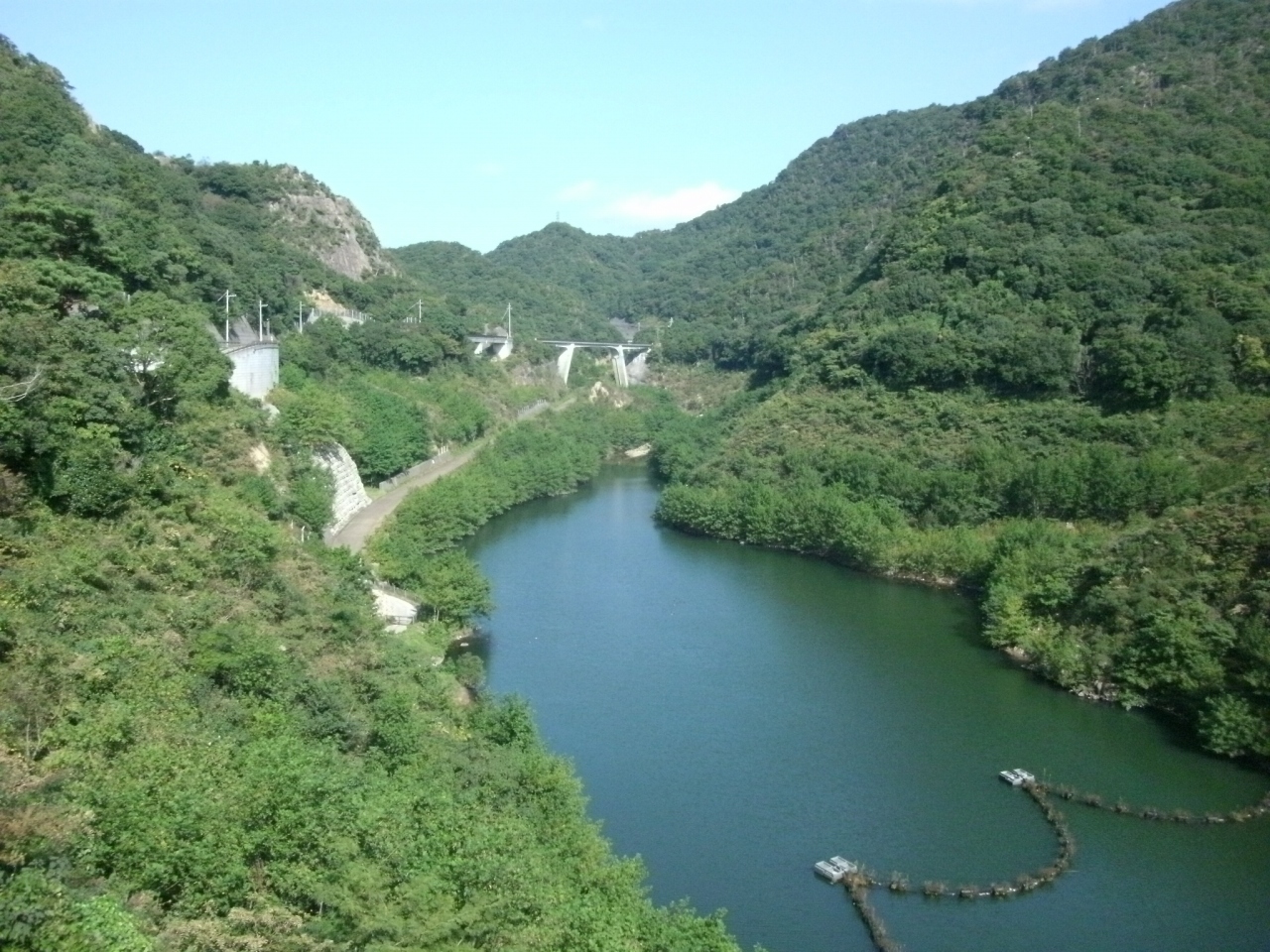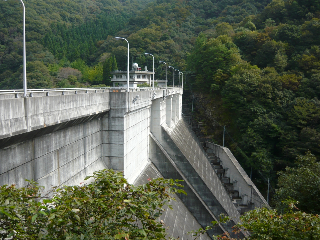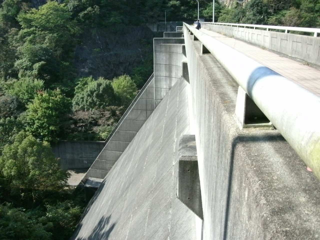 発電を目的とした、堤高102m、堤頂長254mの重力式コンクリートダムです。竣工が1995年と言う比較的新しい古いダムでシンプルな形をしています。ダム堤体上は車は通行できませんが歩いてなら通行が可能です。高さは102mもありおそらく兵庫県では一番高いダムでダム堤体上から下流側を覗くと迫力満点です。