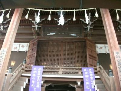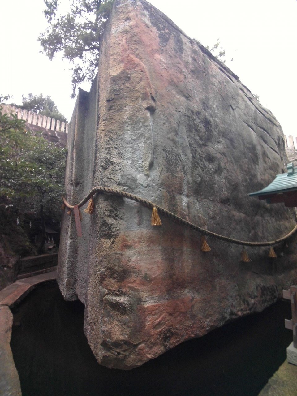 神社の裏手に、水面に浮かんでいるように見える一辺が5mほどの立方体の形をした巨大な石造物があります。巨石の周りにはお社や壁があって、狭くて写真を撮るのがとても難しく、超広角レンズを用いて撮りましたが形がゆがんでしまいました。誰が、何のために作ったのか、何とも不思議な光景でした。