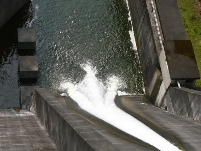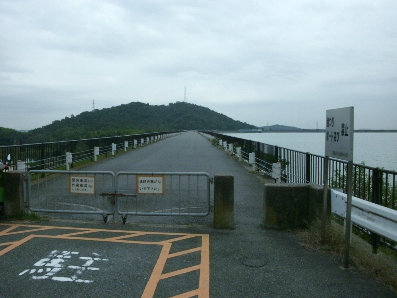 堤上は車は通行できませんが、歩いて通ることができます。堤高が比較的低いため、堤上から下流を眺めてもそれほど迫力はありませんが、オリフィスから少し放流されている姿を見ることができました。