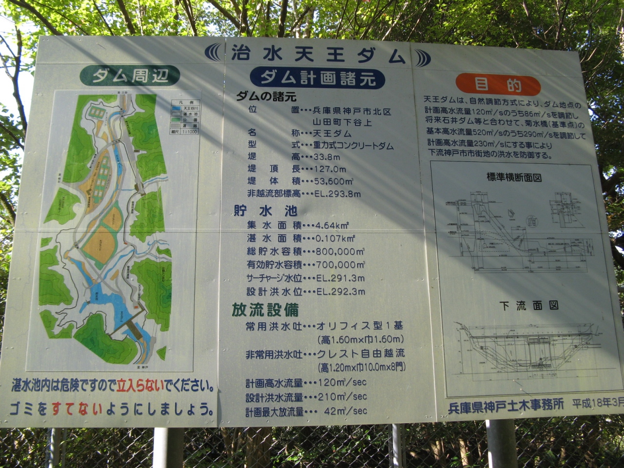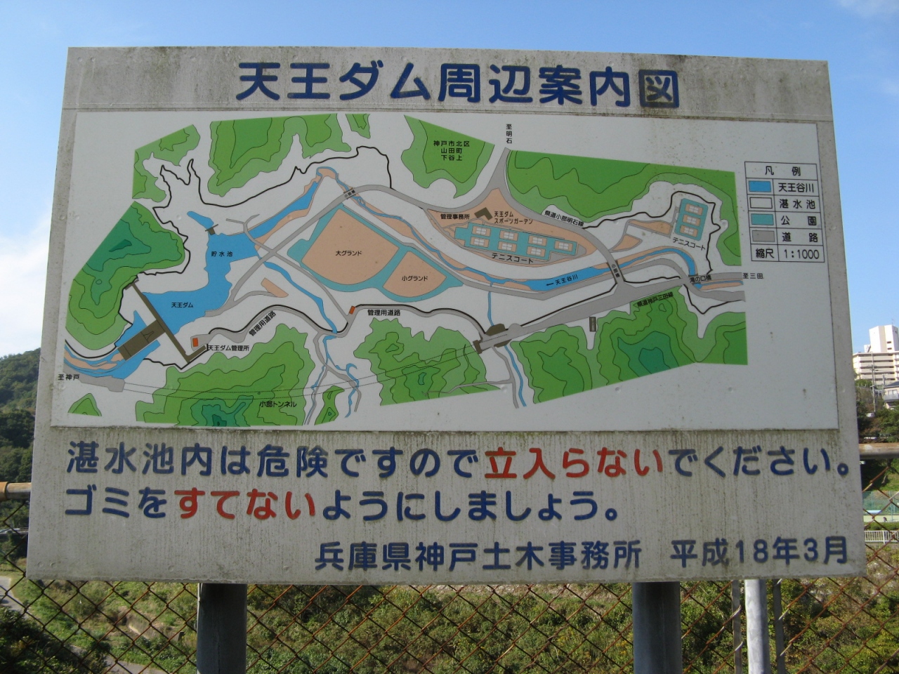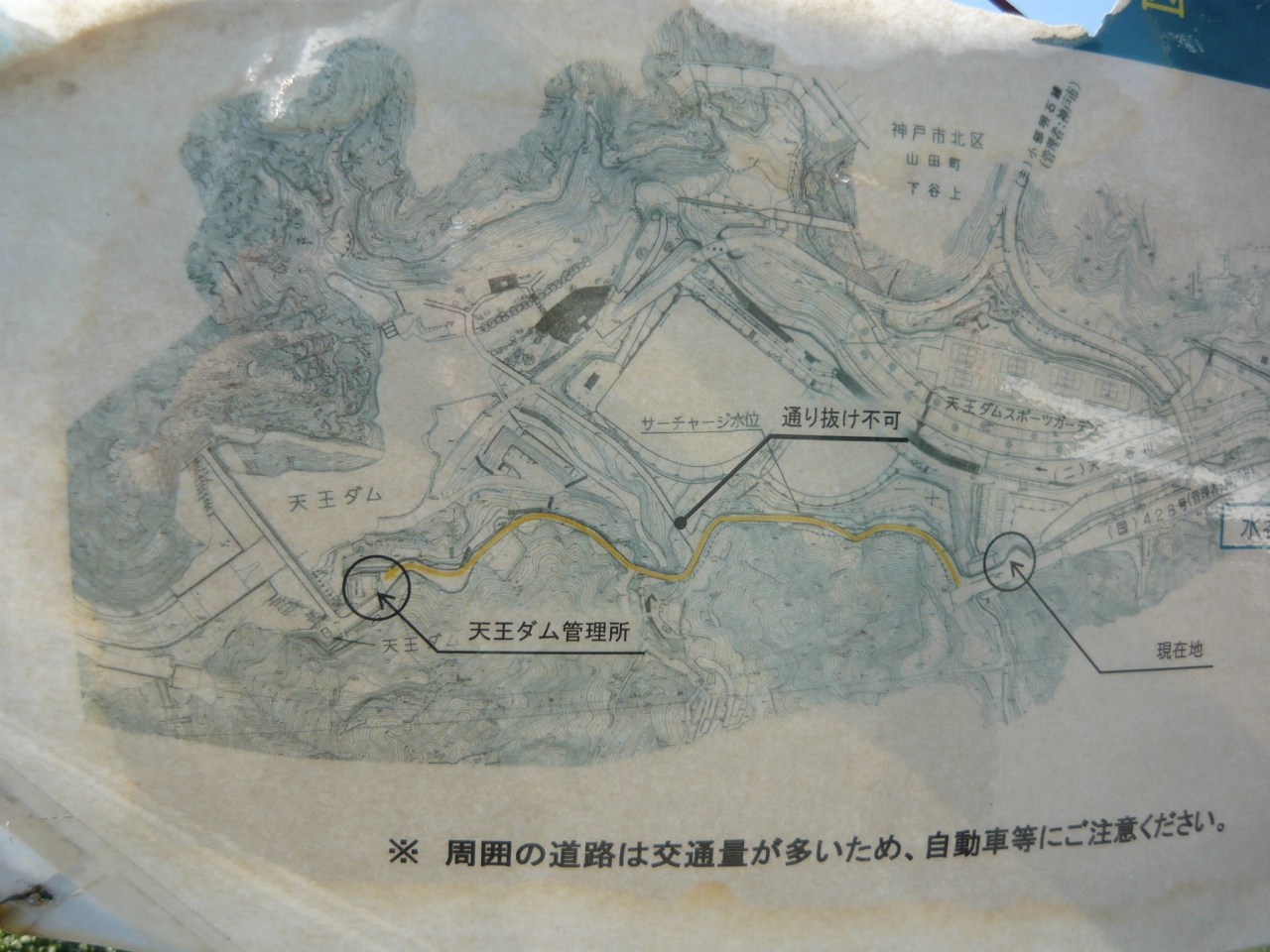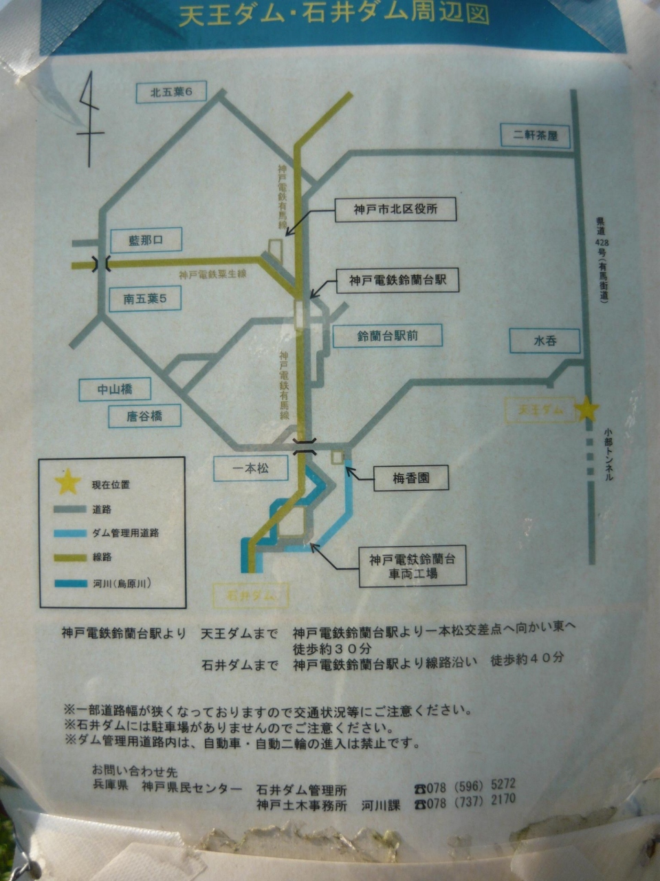 神戸市の中心部からなら、有馬街道(国道428号線)の小部トンネルを抜けてすぐ左手にある間道に入り、400mほど道なりに進むと「天王ダム」に至ります。間道入り口に案内図があり、途中の道は狭いです。