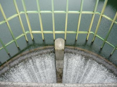 竣工が1985年と比較的古く、クレストゲートがあるシンプルな構造です。ダム堤体上は車の通行はできませんが歩いて通ることができます。このダムの見所は、“半円越流式”の洪水吐で、ダム堤体上から覗くとサラサラと吸い込まれる水の波紋がとても綺麗に見えました。