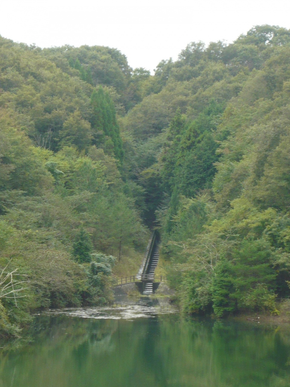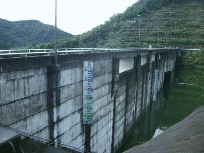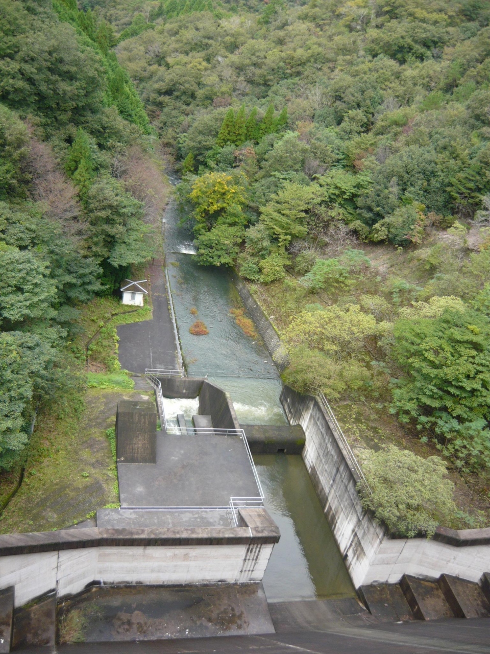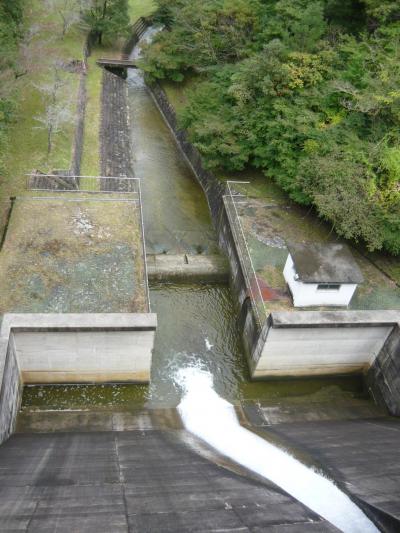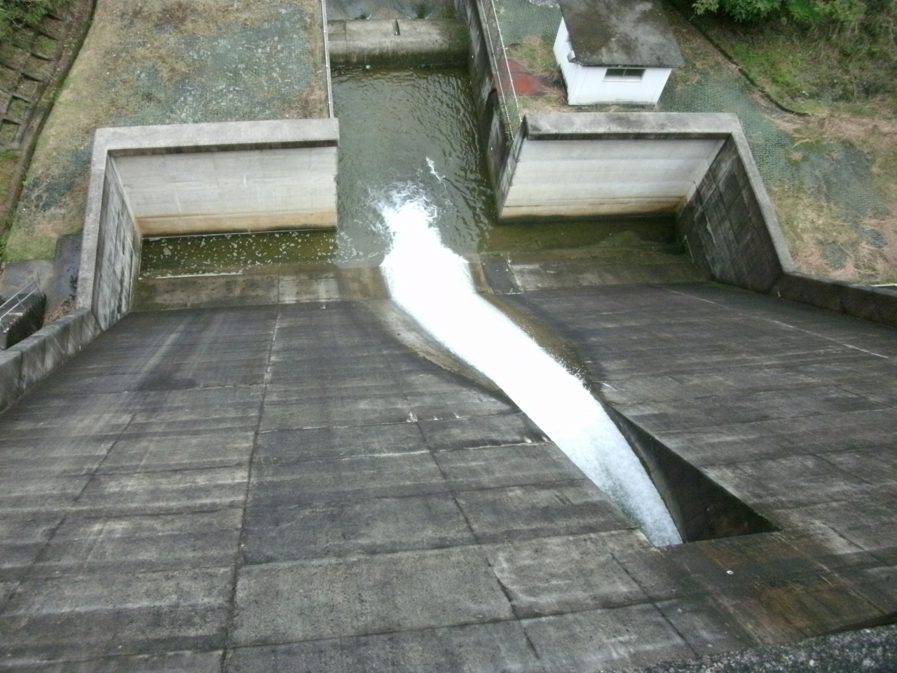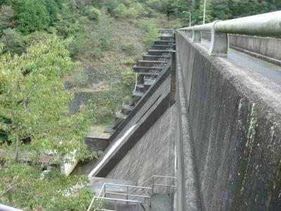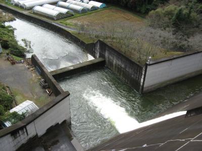 竣工が1991年と言う比較的新しいダムで、自由越流方式のシンプルな構造で、ダム堤体上は、人は通れますが車の通行は不可です。小規模なダムで高さも低く、ダム堤体上から下流側を覗いてもそれほど迫力はありませんが、常用洪水吐から放水している様子を観ることができました。