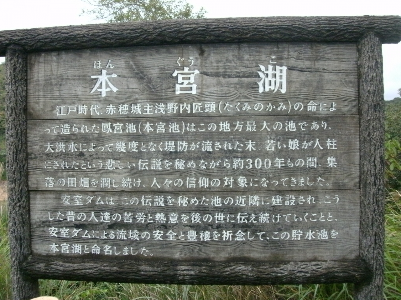 ダムによって造られた人造湖は“本宮湖”とよばれているそうで、現地にある説明板には『江戸時代、赤穂藩主浅野内匠頭の命により造られた鳳宮池(本宮池)ががあったが、ダムにより水没。昔の人達の苦労と熱意を後世に伝え、安室ダムによる流域の安全と豊穣を祈念して、その名を残し本宮湖と名づけた。』とありました。