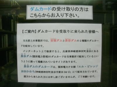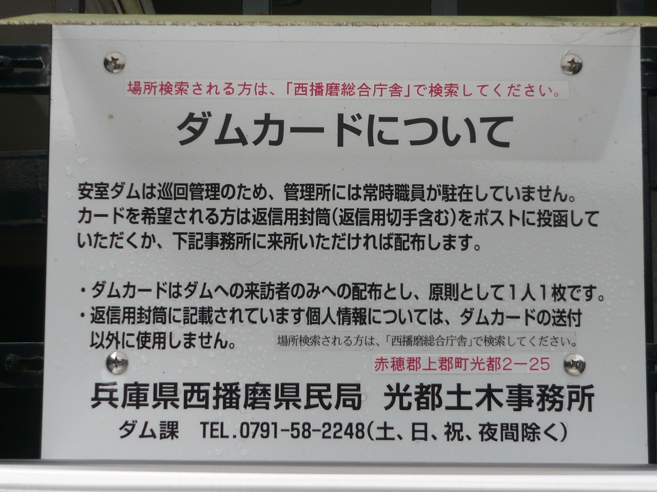 訪れたときは管理所が無人で、“光都土木事務所”に伺ってダムカードを頂くことができました。なお、この時、インターネット上で“ハセダム”についても、“光都土木事務所”でダムカードがもらえるとの間違った情報が出回っていると話を係員の方から伺いました。事務所の入り口にも、その旨の表示(添付写真参照)があったので、“ハセダム”のダムカードを収集される人は注意してください。- 旅行時期