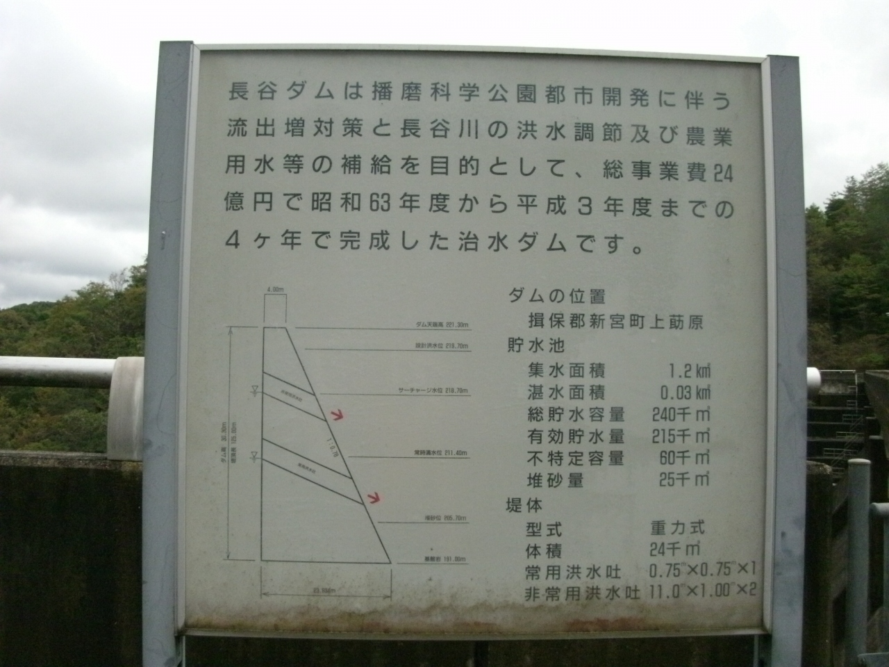 光都(播磨科学公園都市)の県道28号線から“一宮電機モータ技術研究所”の前に入り、右手に道なりに400mほど進むと「長谷ダム(ナガタニダム)」に至ります。兵庫県には二つの“長谷ダム”があります。一つは“ナガタニダム”でもう一つは“ハセダム”と読みますので間違わないようにしましょう。なお、ハセダムは兵庫県神崎郡神河町長谷にあります。