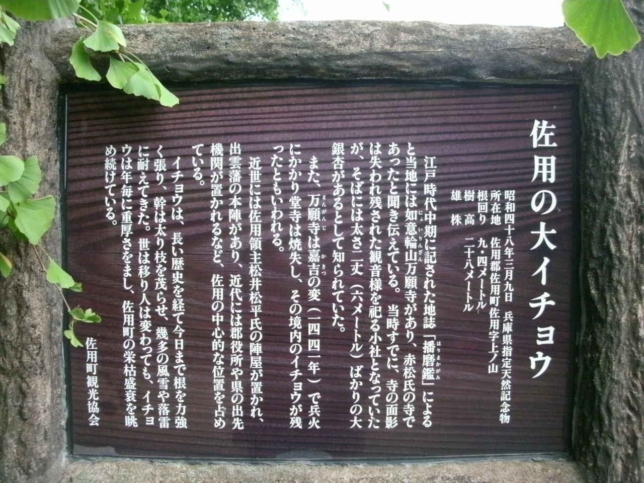 大変樹高が高いので、近くに行けば少し離れていても判ります。すぐそばに、車が5~6台停められる駐車場が整備されていて、駐車場の奥が小さな公園になっています。現地にあった説明板によると、大イチョウは、根回り9.4m、樹高28mで、兵庫県の天然記念物にも指定されています。由緒など詳細は説明板の写真をアップしますので参照ください。