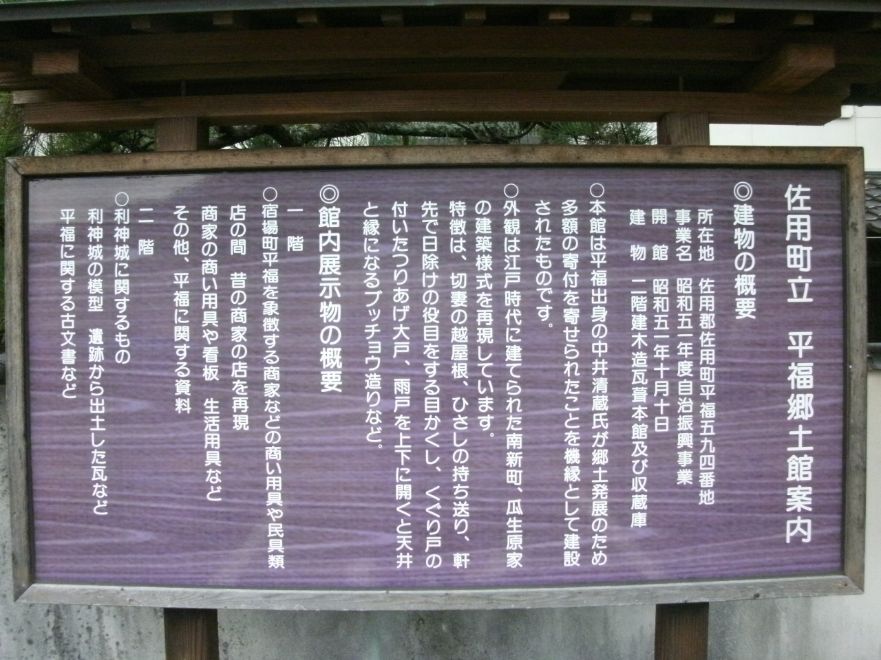 郷土館の前に平成21年の台風9号による大水害の説明板があり、近くを流れる佐用川が氾濫して、このあたり一帯が1.1mの高さまで水没したという印と説明があり驚きました。