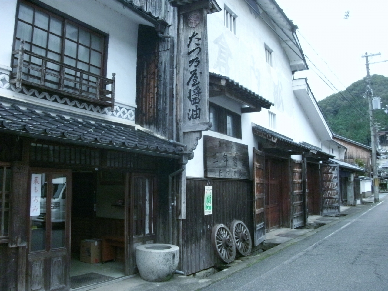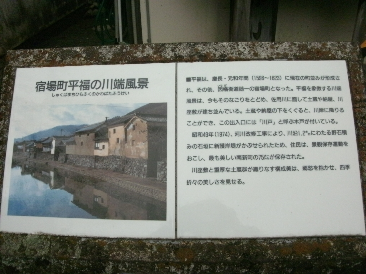 因幡街道は江戸時代に整備された脇街道の一つで、播磨国姫路(兵庫県姫路市)を始点として、因幡国鳥取(鳥取県鳥取市)に至る路線です。その間には11の宿場があるが、街道最大の宿場町として栄えた“平福”は、今も本陣跡や代官所跡などの史跡や元禄年間から醤油屋を営む“たつの屋醤油”の醤油蔵、白壁に連子窓・格子戸の町家などが整備・保存されていて、静かでなかなかいい雰囲気です。また、宮本武蔵の生誕地に近いことから、武蔵が初めて決闘した場所が街道の外れに残されています。