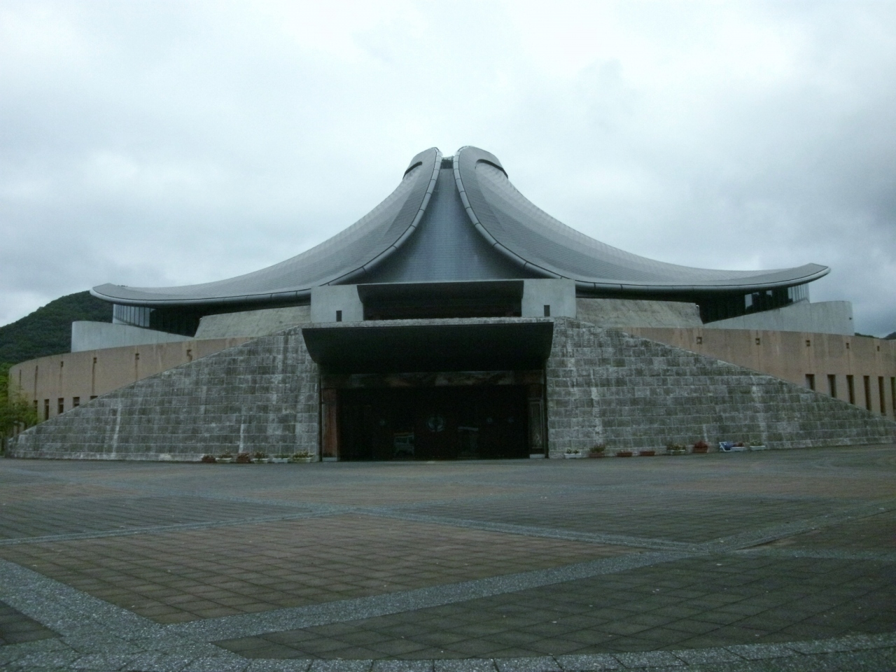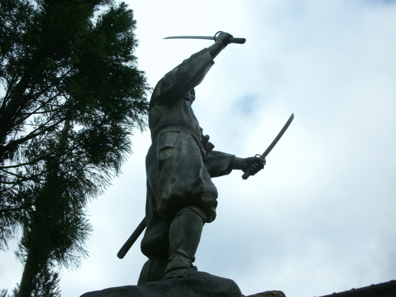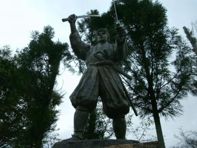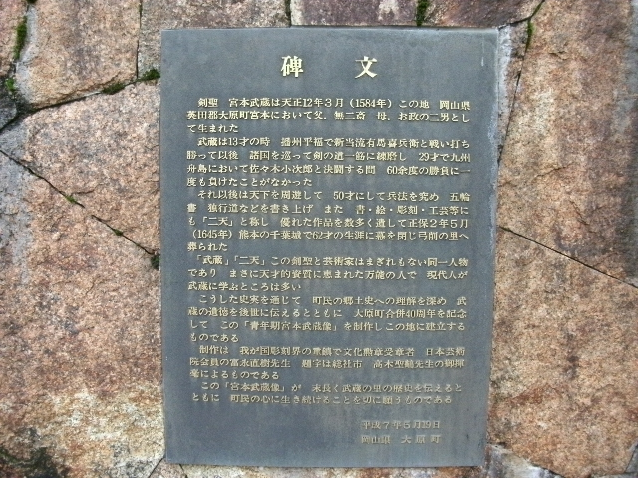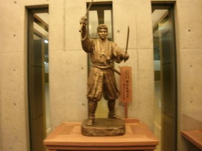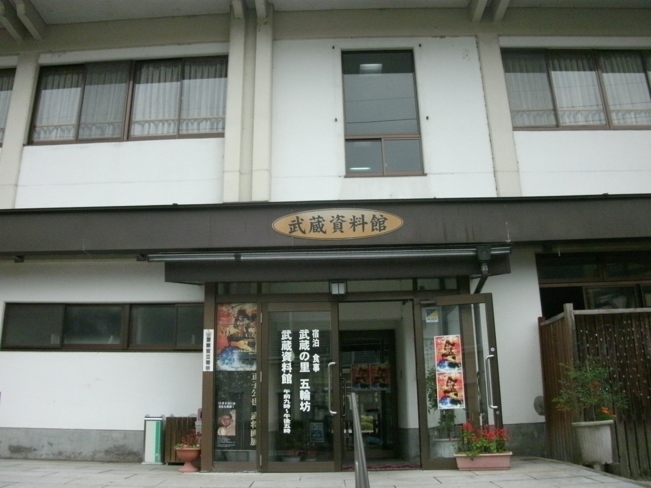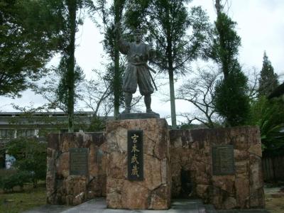 広い敷地に建つ立派な武道施設で、反り返った変わった屋根のデザインは宮本武蔵が作った刀の鍔をモチーフにしたものだそうです。館内に入ったところに二刀流の姿の宮本武蔵の銅像が立っています。若い時の武蔵をモチーフにしたようで、なかなかイケメンでした。スポーツ利用しなくても、入館できるようなので武蔵ファンは是非ご覧になられることをオススメします。
