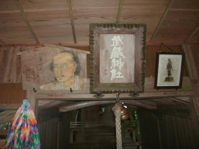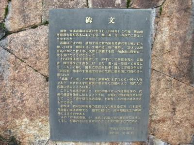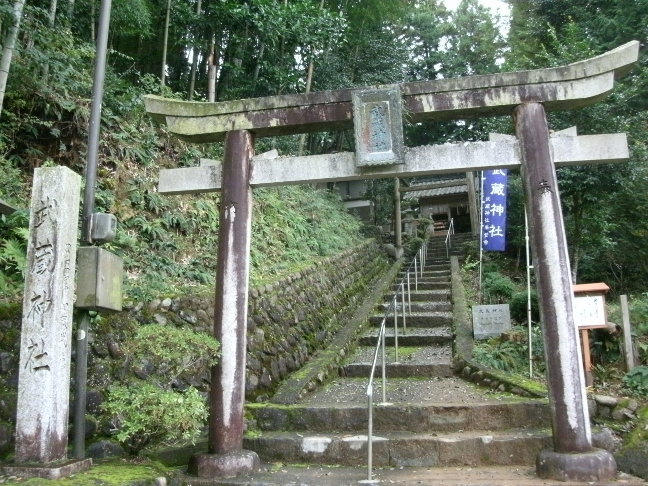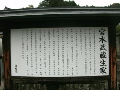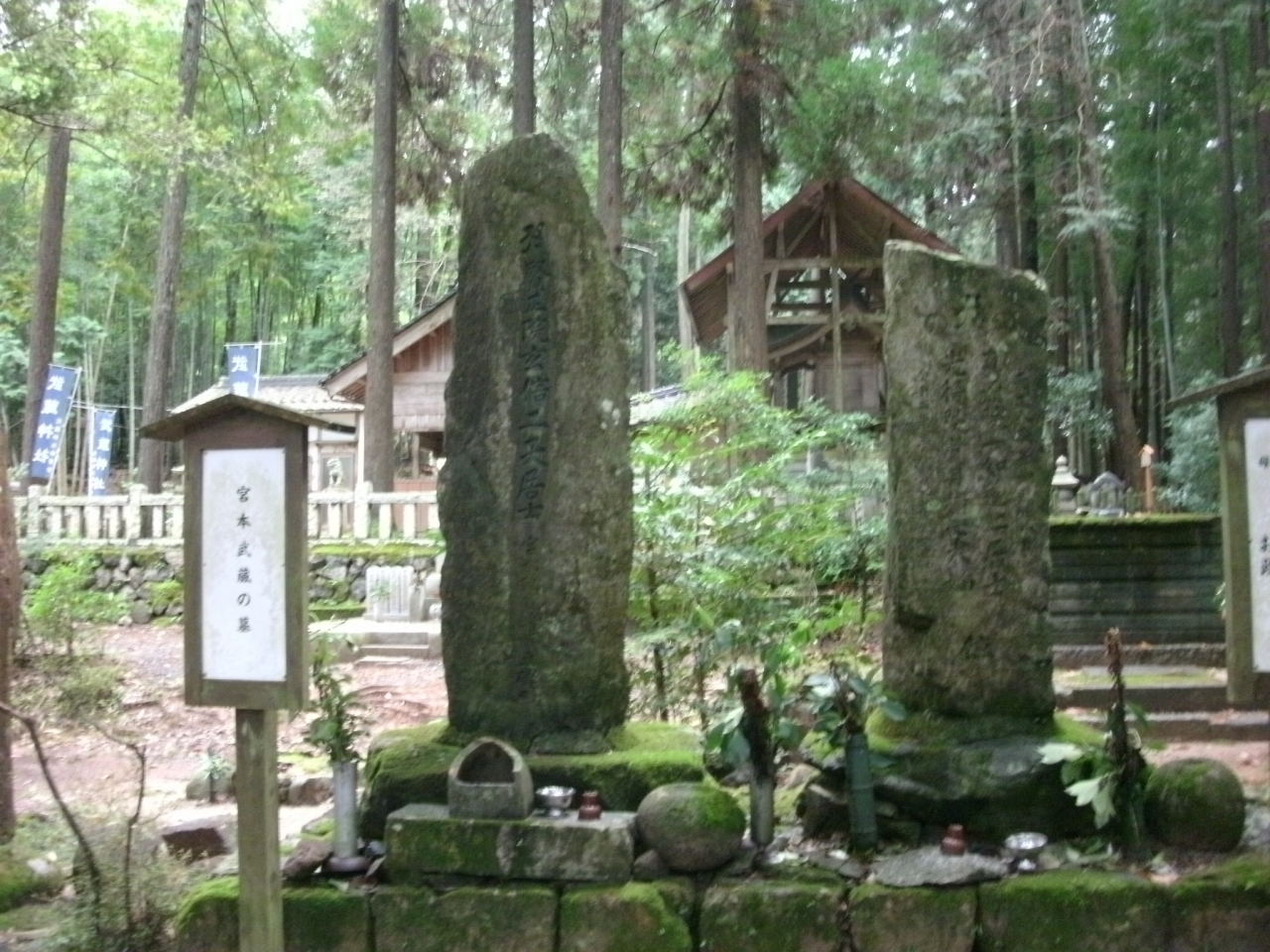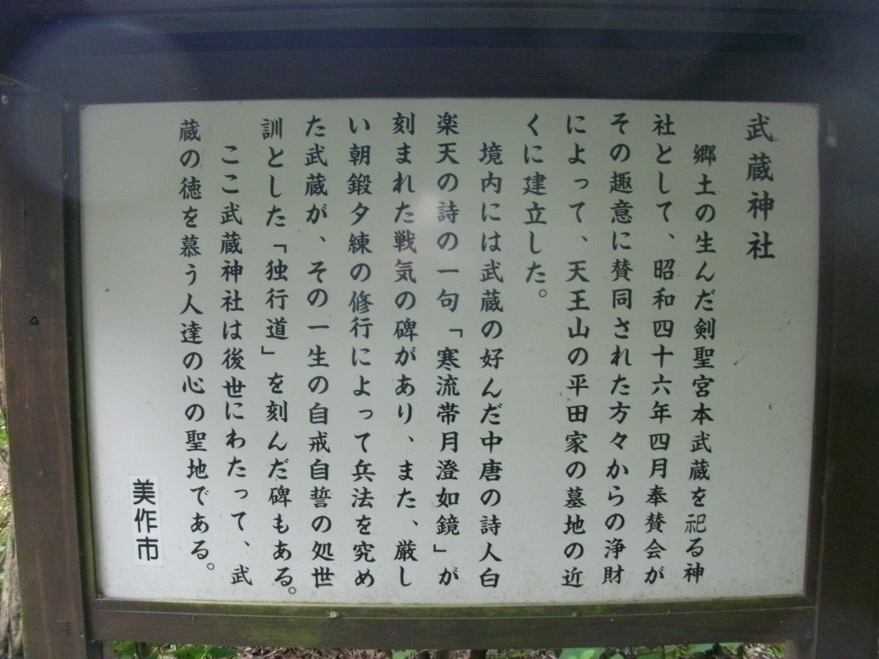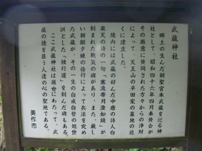 “武蔵の里”の外れ、静かな山の麓にあります。一見、歴史ある古そうな神社に見えましたが、昭和46年に全国の武蔵ファンからの寄付によって建立されたものだそうで、武蔵と武蔵の父の墓があります。生涯負け無しの武蔵にあやかって、合格祈願や必勝祈願などに多くの人が訪れるとか。
