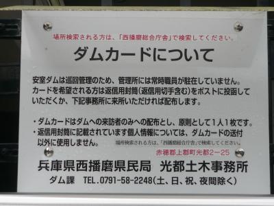ダム見学後、ダムカードを頂くために管理所に立ち寄りましたが管理所は無人で、ダムカードの配布についての表示があったので、光都土木事務所(平日のみ対応)に伺ってダムカードを頂くことができました。なお、管理所に備え付けられているポストに、返信用封筒(切手を貼って)を投函すれば、郵送もしてくれるとありました。詳細については添付の写真を参照ください。- 旅行時期