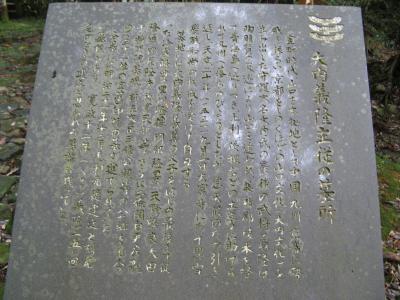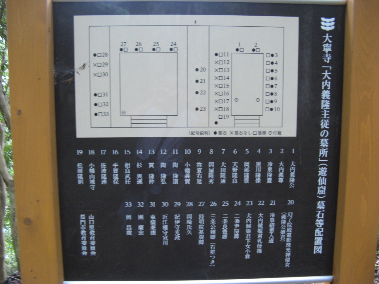 大寧寺の奥まった山すその一角に、義隆の墓を囲むように家臣達の墓が立ち並んでいて、その近くに義隆と家臣たちの名前が記された説明板と墓所の説明石碑があってそれを観ると歴史や主従関係がよく判りました。