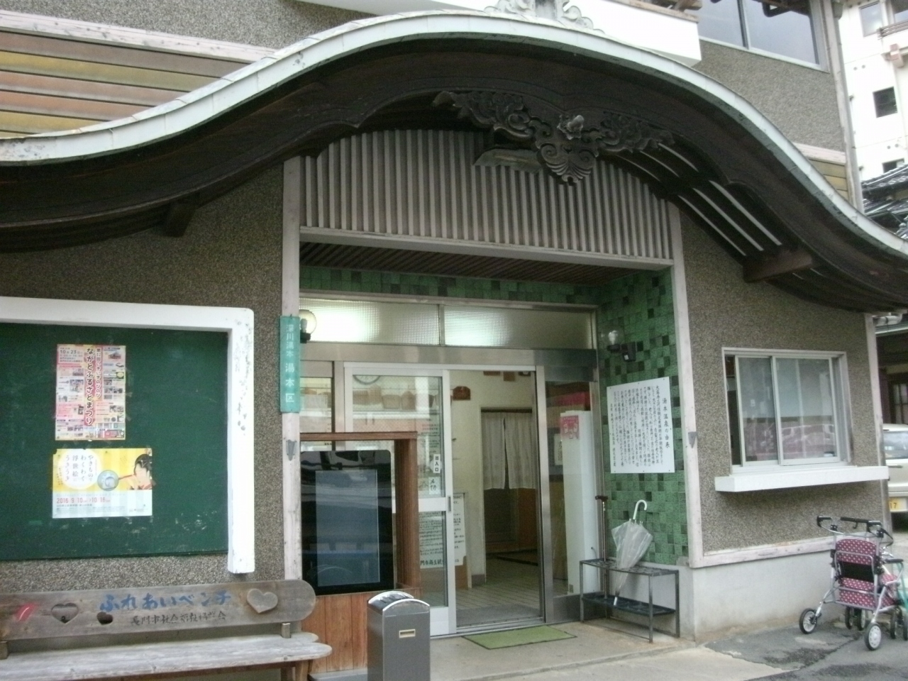 音信川に沿って並ぶ温泉街の中ほど、市営公衆浴場の「恩湯」の横の坂道をほんの少し上がったところに市営公衆浴場「礼湯」があります。