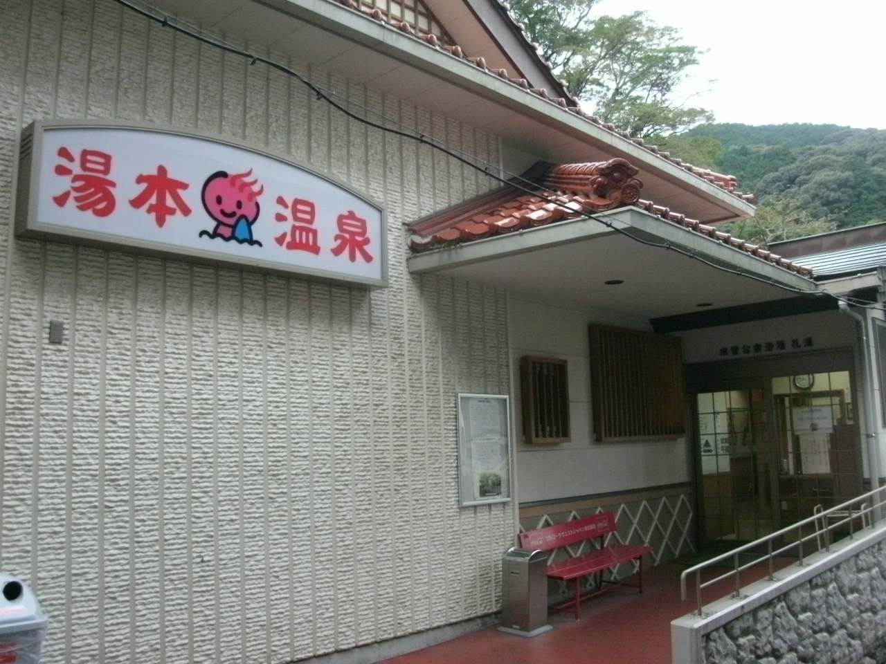 音信川に沿って並ぶ温泉街の中ほどに湯本温泉市営公衆浴場の「恩湯」があります。赤い「湯本温泉」のネオンが印象的な独特の風貌をしたレトロな建物なので見落とすことはありません。