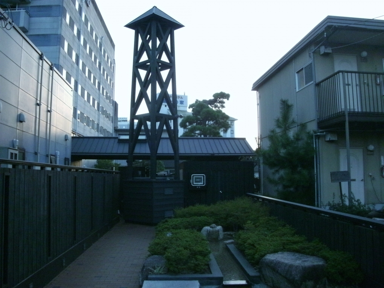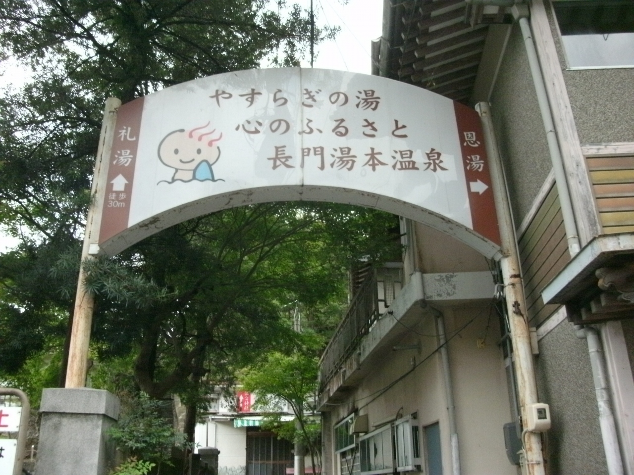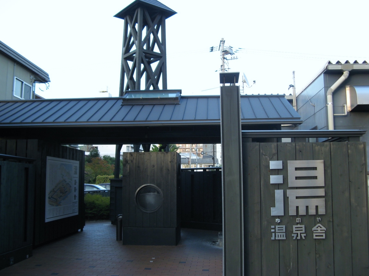 湯田温泉街の中心、ホテル喜良久の駐車場の前に「温泉舎」があります。黒を基調とした木造和風の建屋で高さ8メートルのやぐらがあるので見落とすことはないと思います。