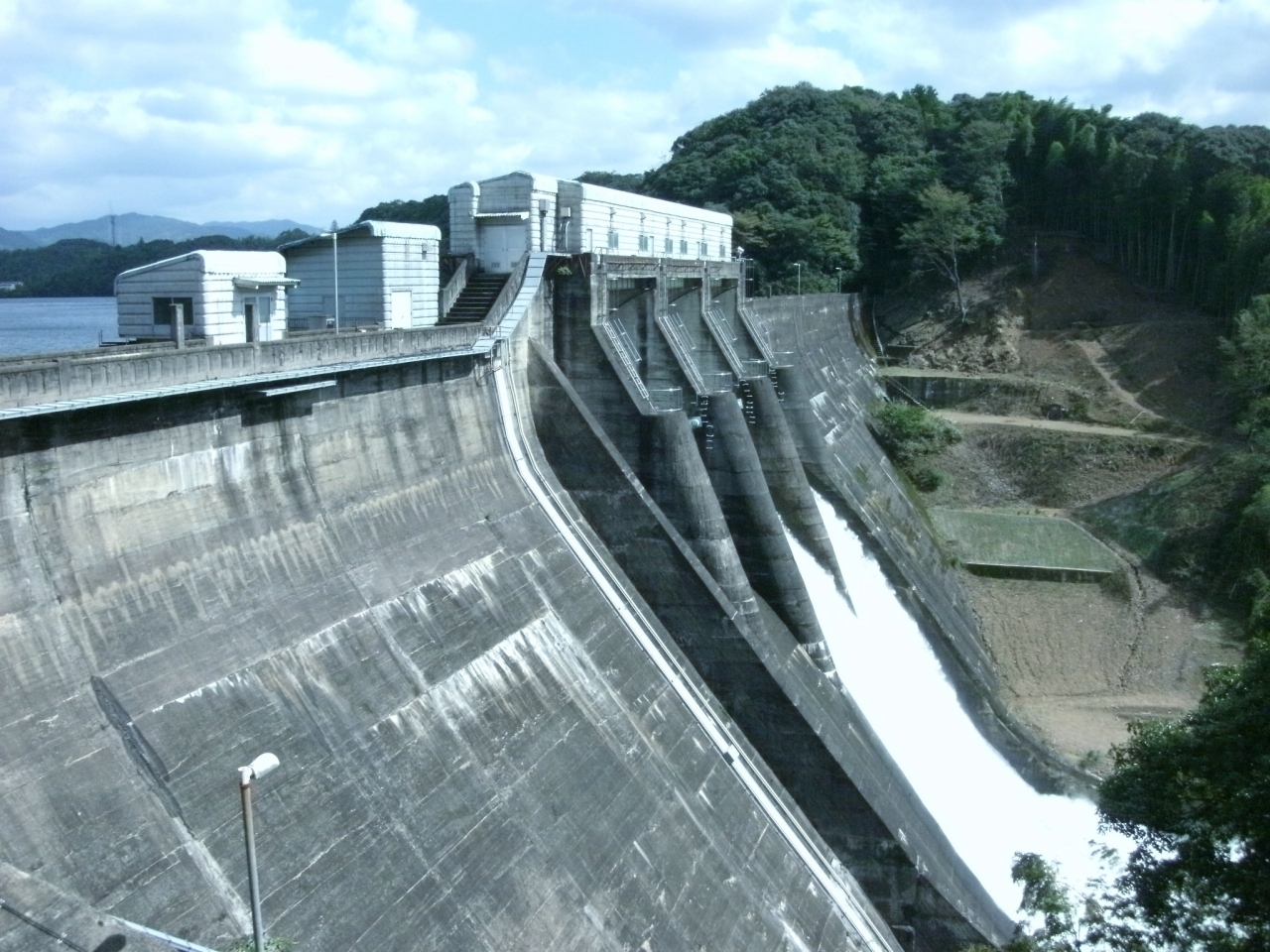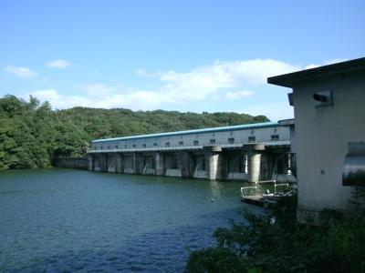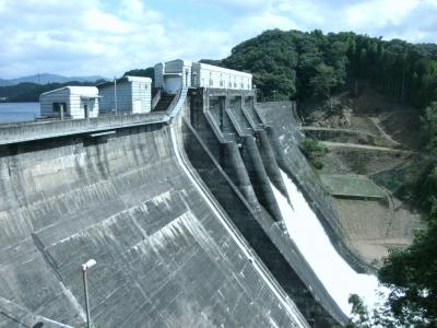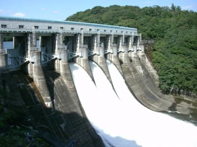 竣工が1949年という古いダムで、堤体高さはそれほどでもないが、提体に8門並んだラジアルゲートやゲート操作室建屋は古いダムらしくなかなかいい眺めです。残念ながら、堤体上は進入禁止になっていて上がることができませんでしたが、3門のゲートから放水されているのを見ることができてとてもよかったです。