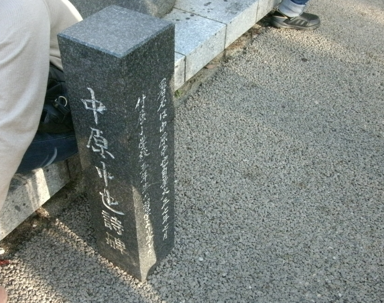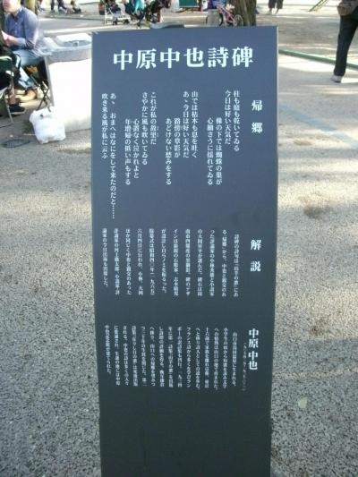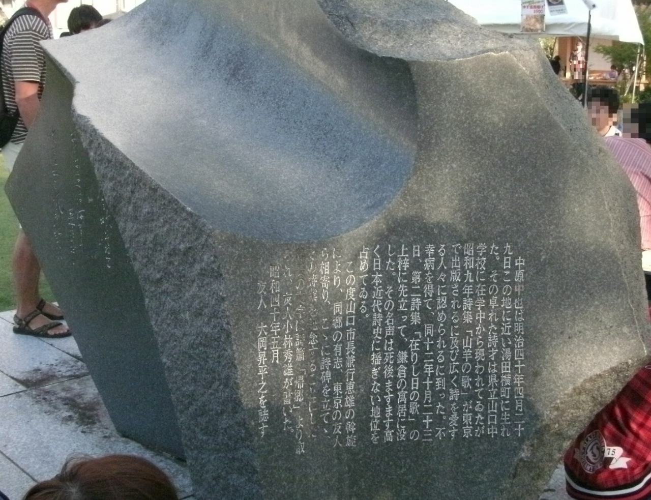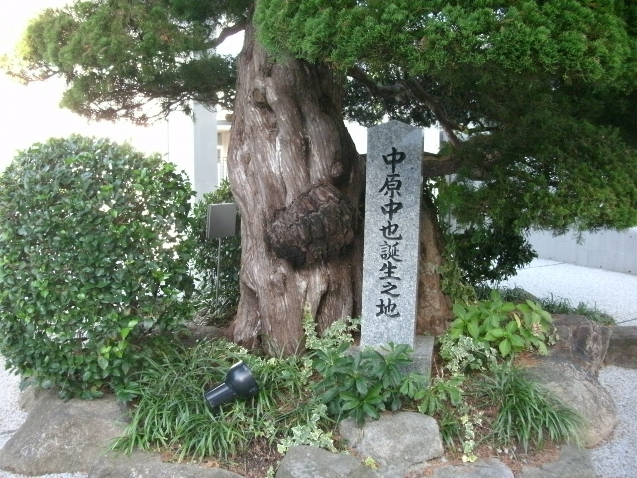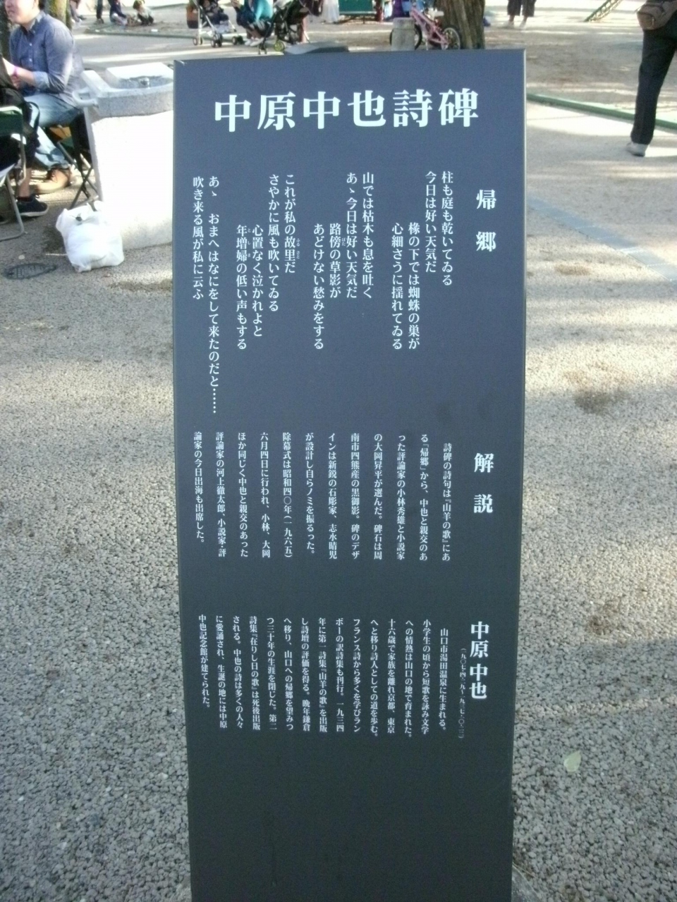 立派な黒御影石に詩集『山羊の歌』に収録されている「帰郷」の一節で、『これが私の古里だ 爽やかな風も吹いている・・・』と刻まれています。傍には、詩の全編や中也についての解説が記された説明板(添付写真を参照ください)があるので、中也をよく知らなくてもわかりやすいです。