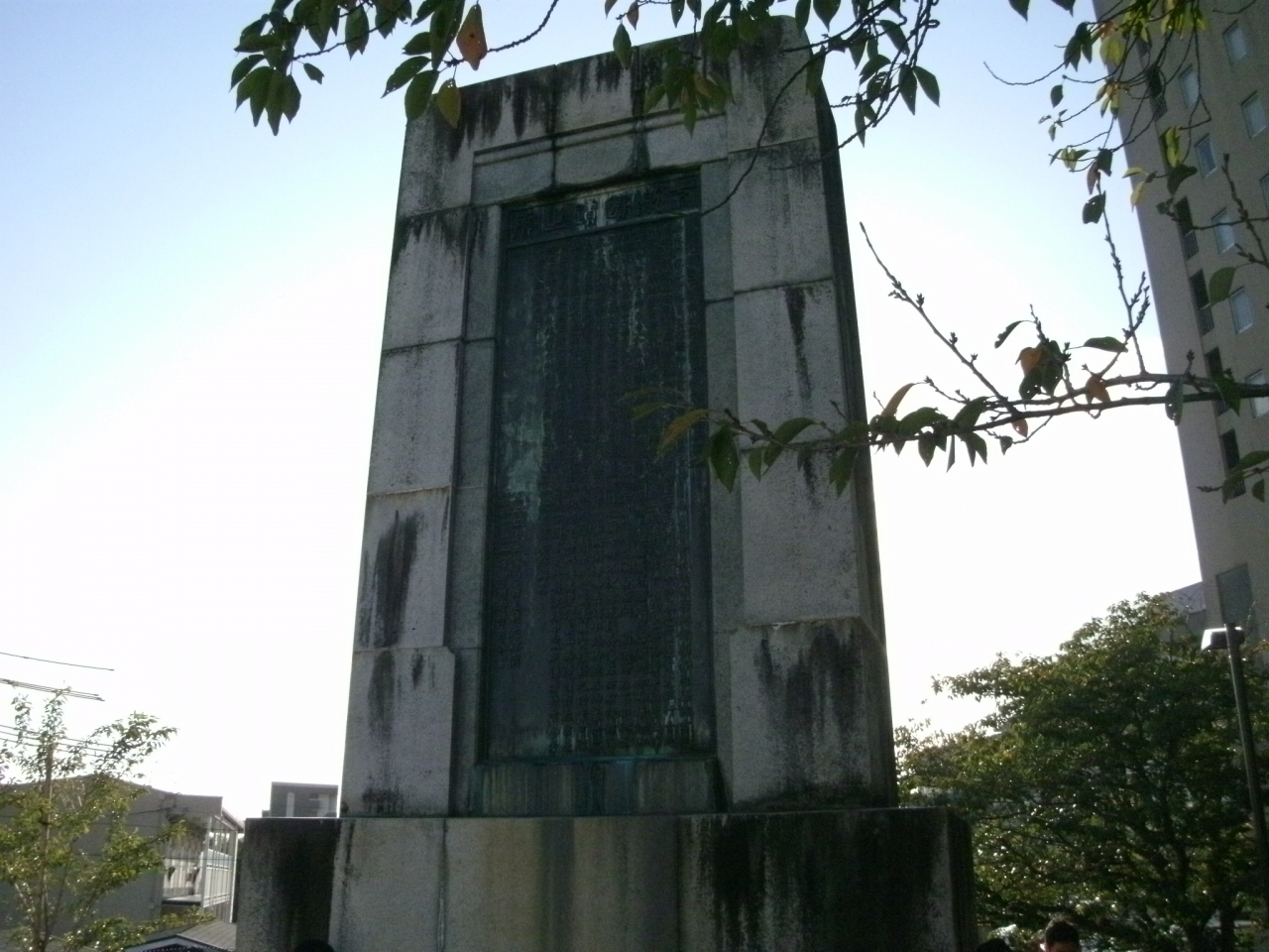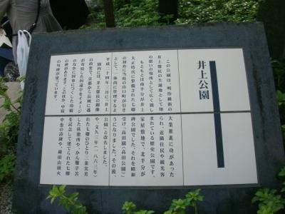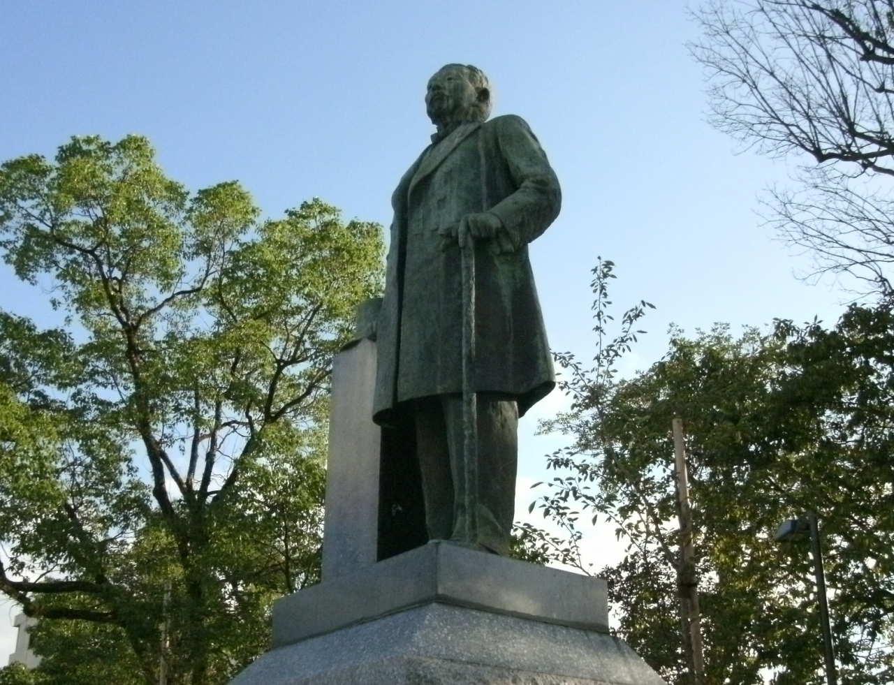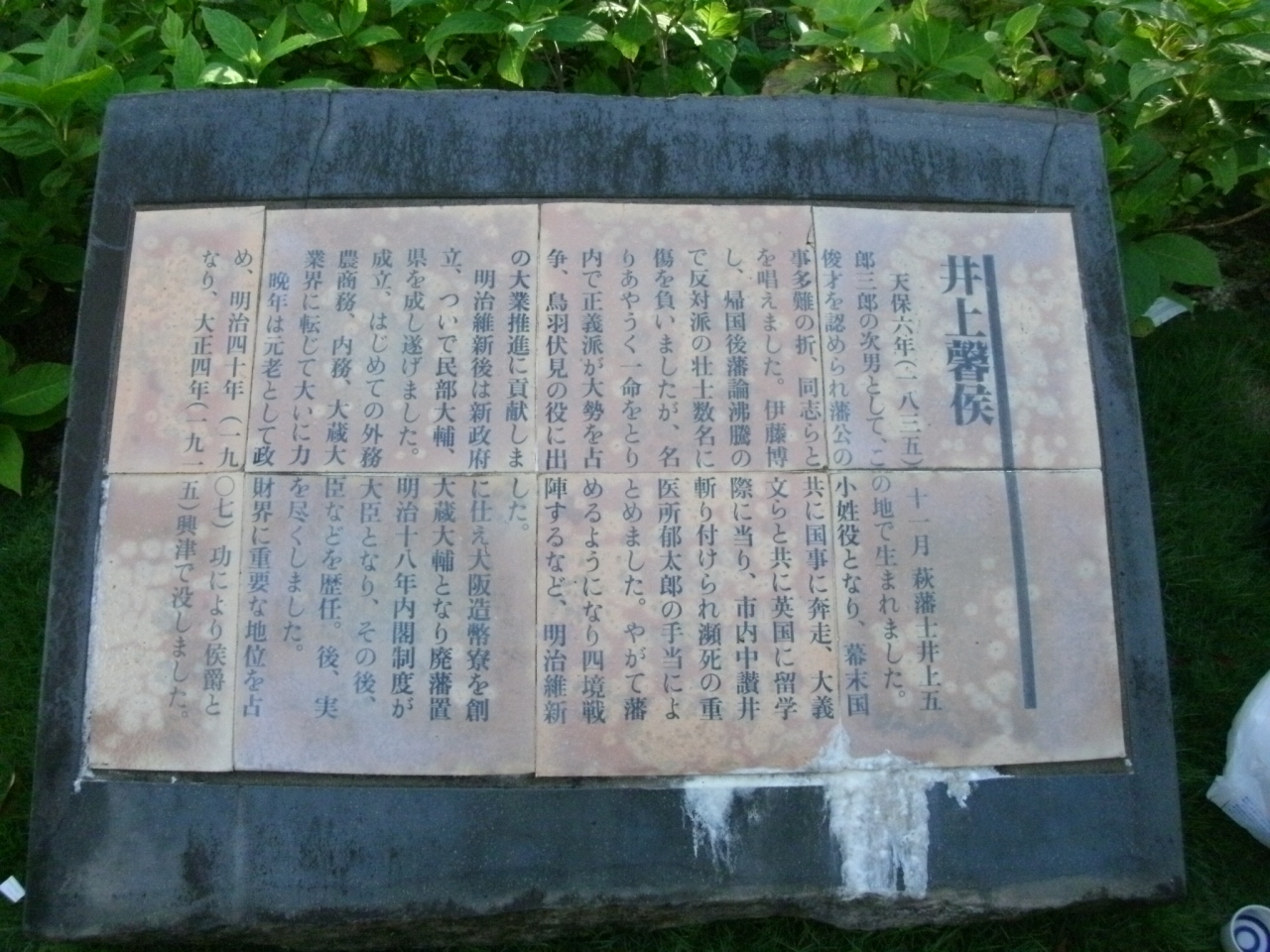 大きな御影石の台座の上に、等身大もあろうかと思われる立派な銅像で見落とすことはありません。傍にある説明碑(添付写真を参照ください)に、井上馨公の生涯について記されています。