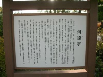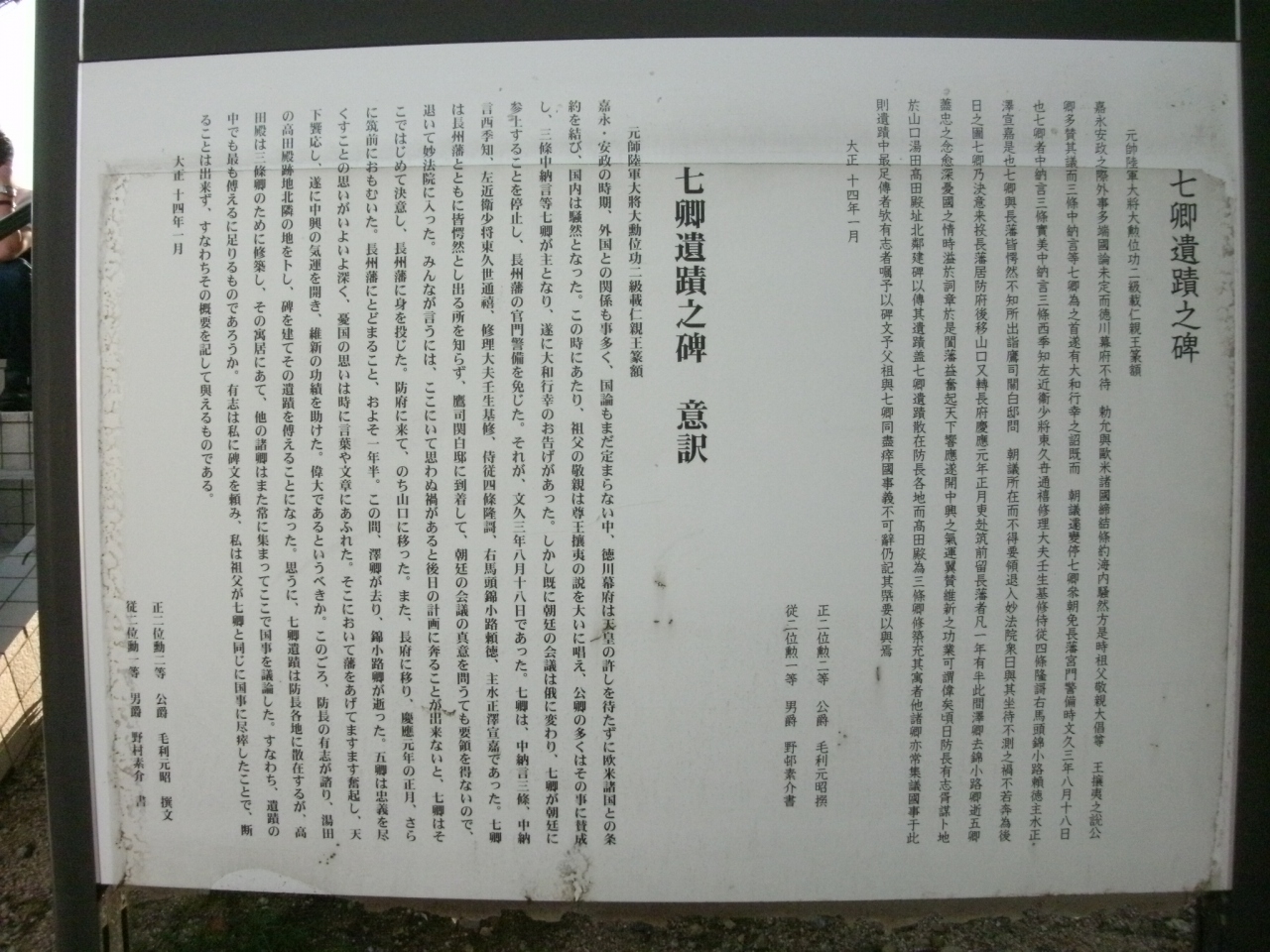 階段が設けられた少し高い位置に立派な碑があるので、上って見てみましたが、見にくいうえに漢文で書いてあってよく判りませんでした。傍にある、原文と意訳が書かれた説明板(添付写真を参照ください)を見て、幕末に京都の政変で都落ちしてきた、尊王攘夷派の三条実美ら七卿の忠誠を偲び建立されたものということが判りました。