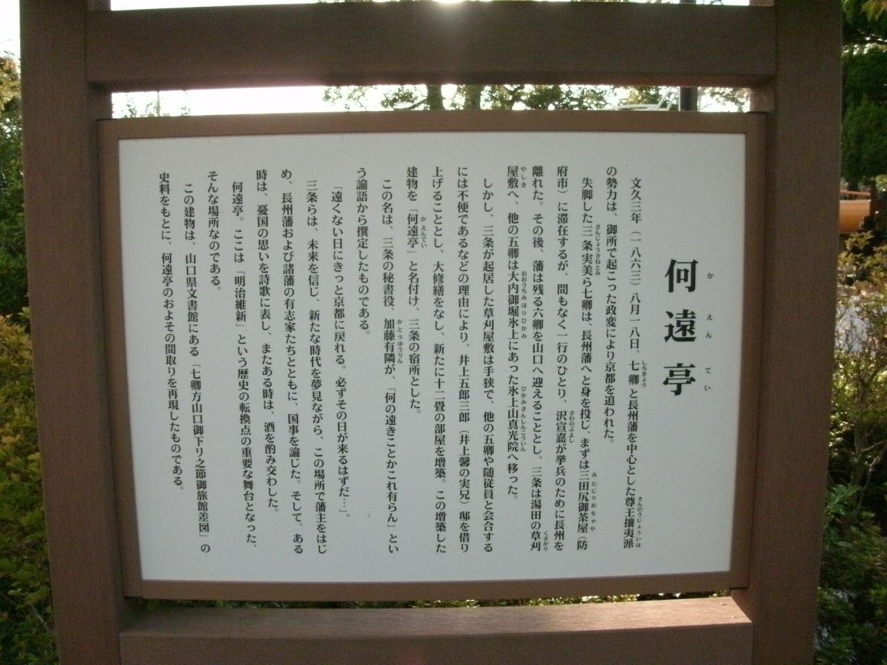 公園内には、七卿落ちの際に三条実美らの宿舎にあてた建物を再現して建てられたという“何遠亭”や明治維新の元勲の一人である井上馨の銅像、三条実美の歌碑などがあるので、幕末の歴史に興味のある方にオススメです。- 旅行時期
