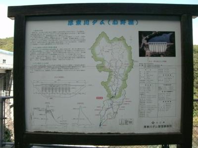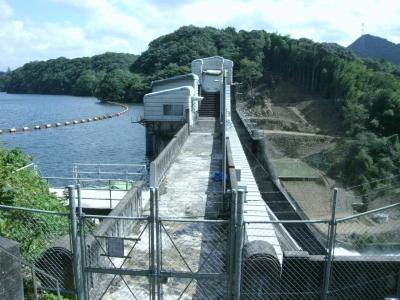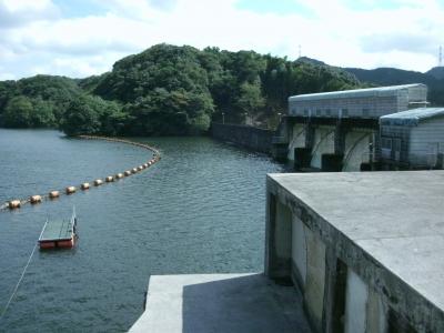 竣工が1955年という古いダムで、堤体高さはそれほどでもないが、提体に3門並んだラジアルゲートやゲート操作室建屋は古いダムらしくなかなかいい眺めです。しかし、操作室がダム堤体上にあるから保安上、ダム堤体周辺はフェンスで覆われて入ることが出来ず、フェンスの網目から覗く以外ないのが残念でした。