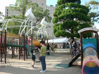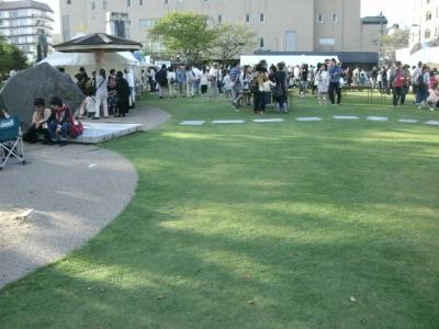 公園内には、中原中也の詩碑や種田山頭火の句碑、三条美実公の歌碑などが建ち、無料で利用できる足湯もありました。一部は広い芝生公園となっていて子供が遊べる遊具もありました。訪れた時は、“湯田温泉酒まつり”の会場になっていて、たくさんの人で賑わっていました。