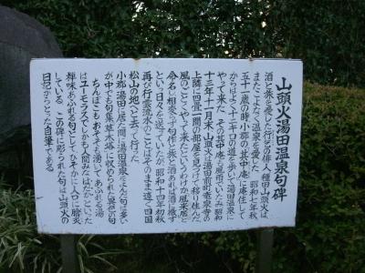温泉街を散策していて2つの句碑を見つけました。一つは、井上公園に『ほろほろ酔うて 木の葉ふる』と刻まれた句碑があり、もう一つは、県道204号線より一筋北側の“錦川通り”にあります。錦川通りのものは、若い女性なら声を出して読むのは恥ずかしい、ユーモアあふれるものでした。少し読みにくい字体ですが、そばに説明板があるのでよく判ります。面白い句なので読んでみてください。- 旅行時期