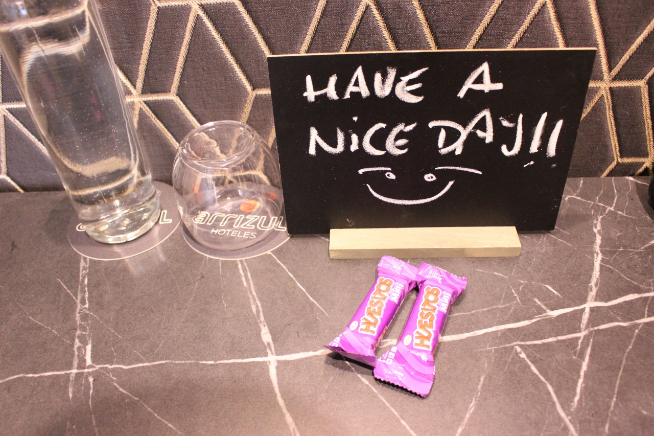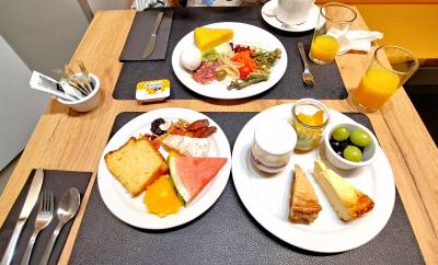 フロントでも朝食のキッチンでも詳しく説明してくれます。ウエルカムドリンクはスペイン産のカバでした。お昼の12時から夜8時まではコーヒーやジュースが無料でいただけました。朝食は温かい物はありませんがマセドニアやジャムの入った手作りヨーグルト、ケーキ類がコンパクトながら豊富でした。