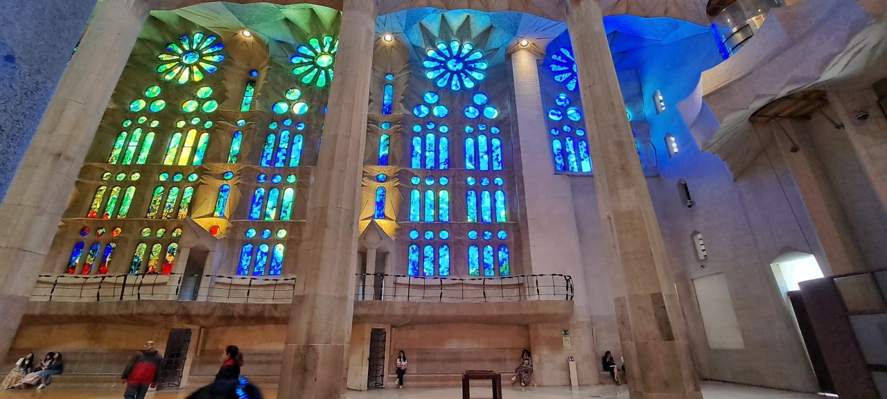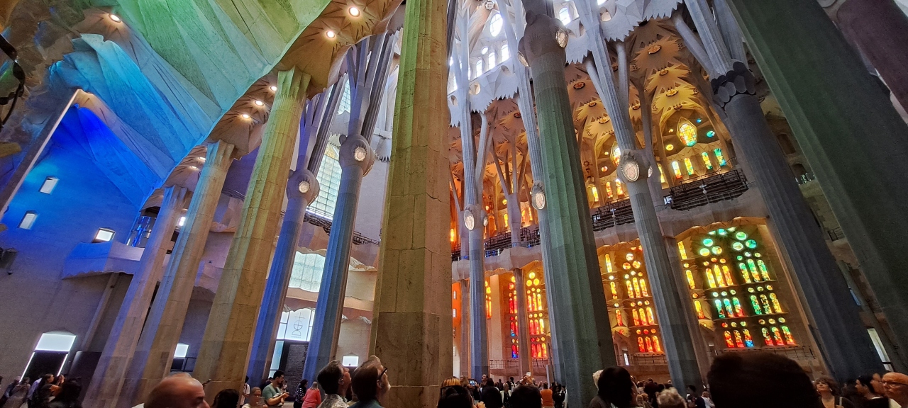 まだ外側の塔は建設途中でしたが内部は完成していました。ステンドグラスや天井にサグラダファミリアらしい特徴が出ていてバルセロナの夕日の色を表した赤やオレンジ色のいステンドグラスや森のような緑や青のステンドグラスは他では見たことがありません。柱の上部は木の枝のように分かれていて自然の中で礼拝できるようにというガウディの思いがあるようです。- 旅行時期