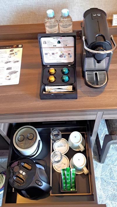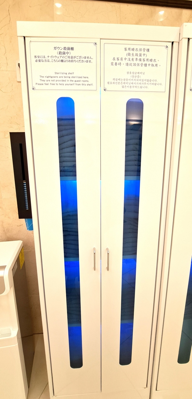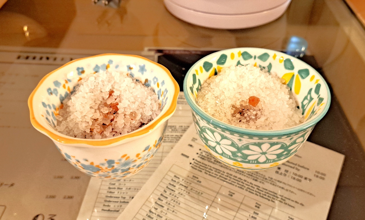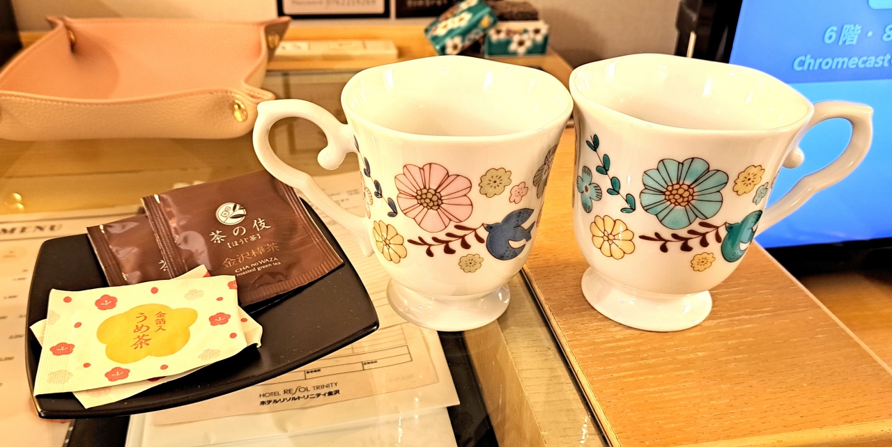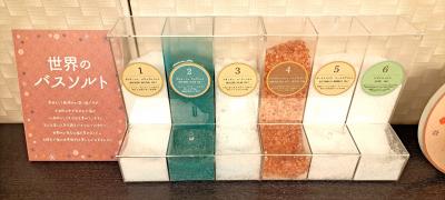 エレベーターホールには選べるバスソルトがあり、器に好きなブレンドで部屋に持って行けます。無料貸出しグッズも製氷機の場所にあり、自由に持って行けます。お部屋にはミネラルウオーターもあり、九谷焼に入ったお香が置いてあり和を感じます。女性専用の部屋ではないのにシートマスクもついていました。