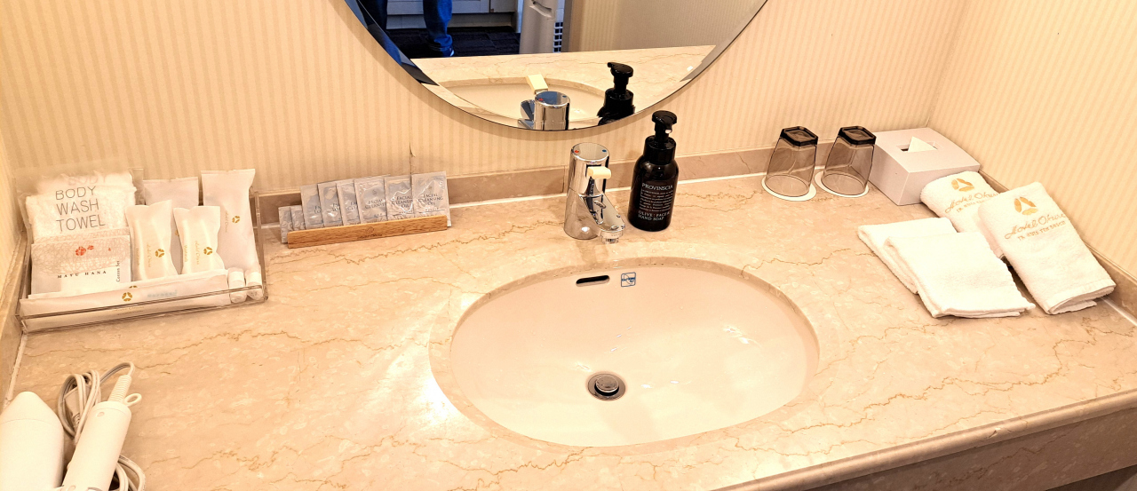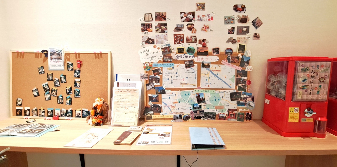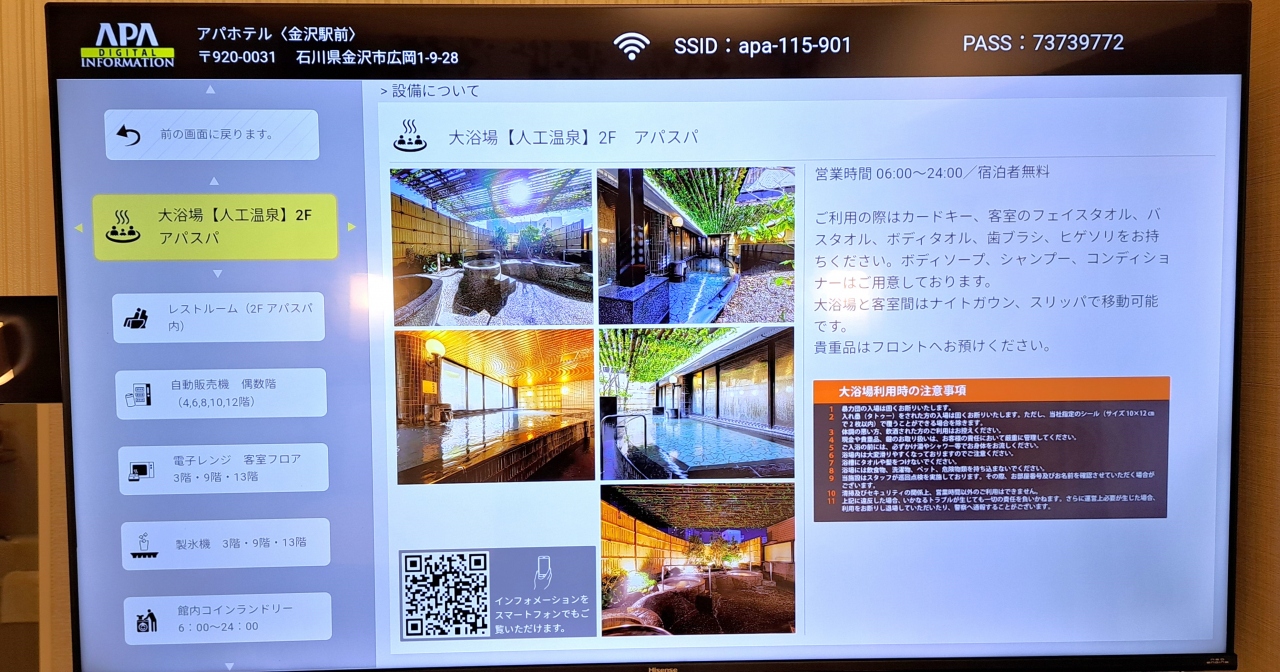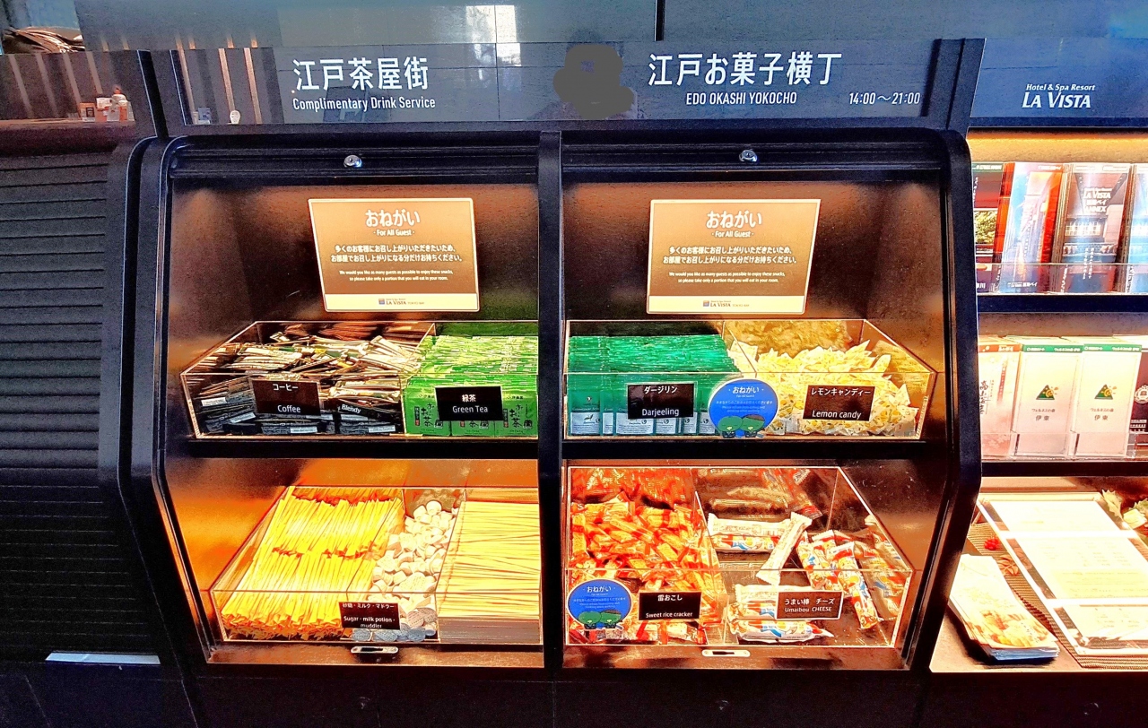 エレベーターホールには選べるバスソルトがあり、器に好きなブレンドで部屋に持って行けます。無料貸出しグッズも製氷機の場所にあり、自由に持って行けます。お部屋にはミネラルウオーターもあり、九谷焼に入ったお香が置いてあり和を感じます。女性専用の部屋ではないのにシートマスクもついていました。