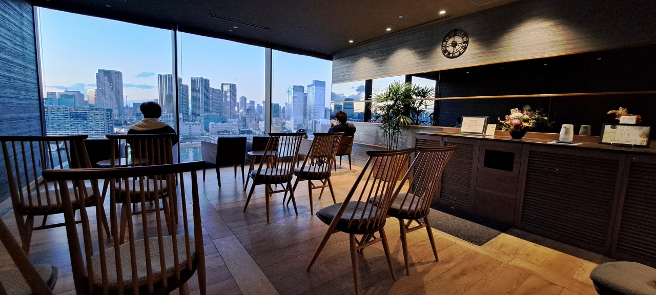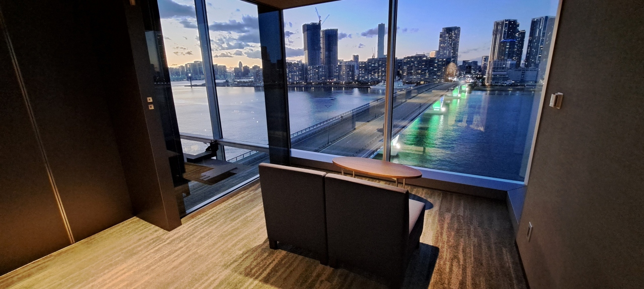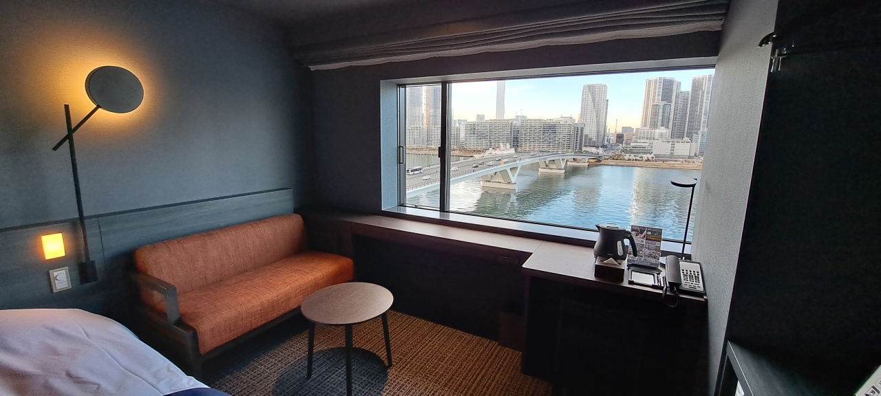 ゆりかもめから歩いてホテルの2階フロントに直結。少し前はただの更地だったのに大きなビルや千客万来も出来て賑やかになっていました。お部屋はハンガーラックが思ったよりたくさんあったのにスーツケースを広げるラックがなかったのが残念でした。 館内はエレベーターホールや自販機やコーヒーマシーン、電子レンジの部屋にまでも川(既に海?)を眺められる椅子があります。お部屋の窓も大きいです。