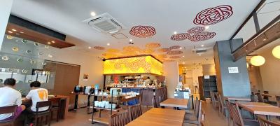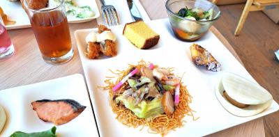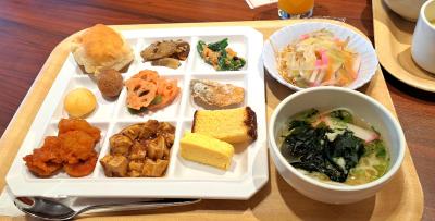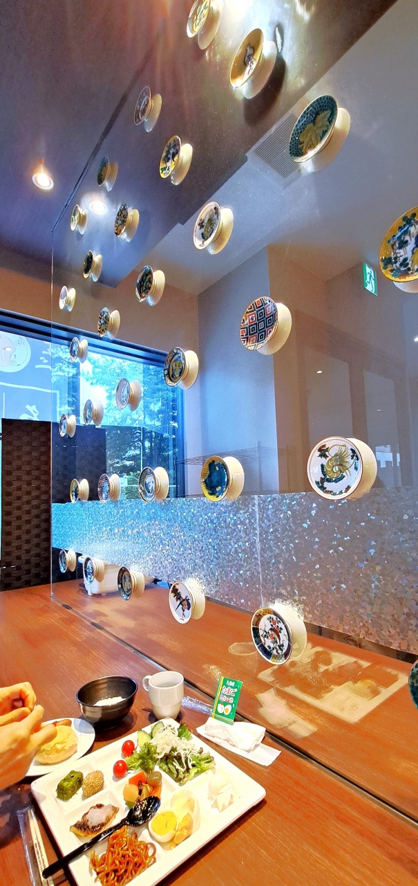 朝食はサラダに金時草ドレッシング、金沢カレー、車麩などもあり、注文すると車麩のフレンチトーストも食べられました。九谷焼がたくさん飾ってあるガラスの仕切りもすてきでした。