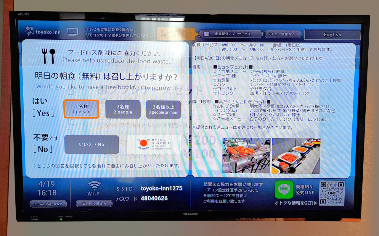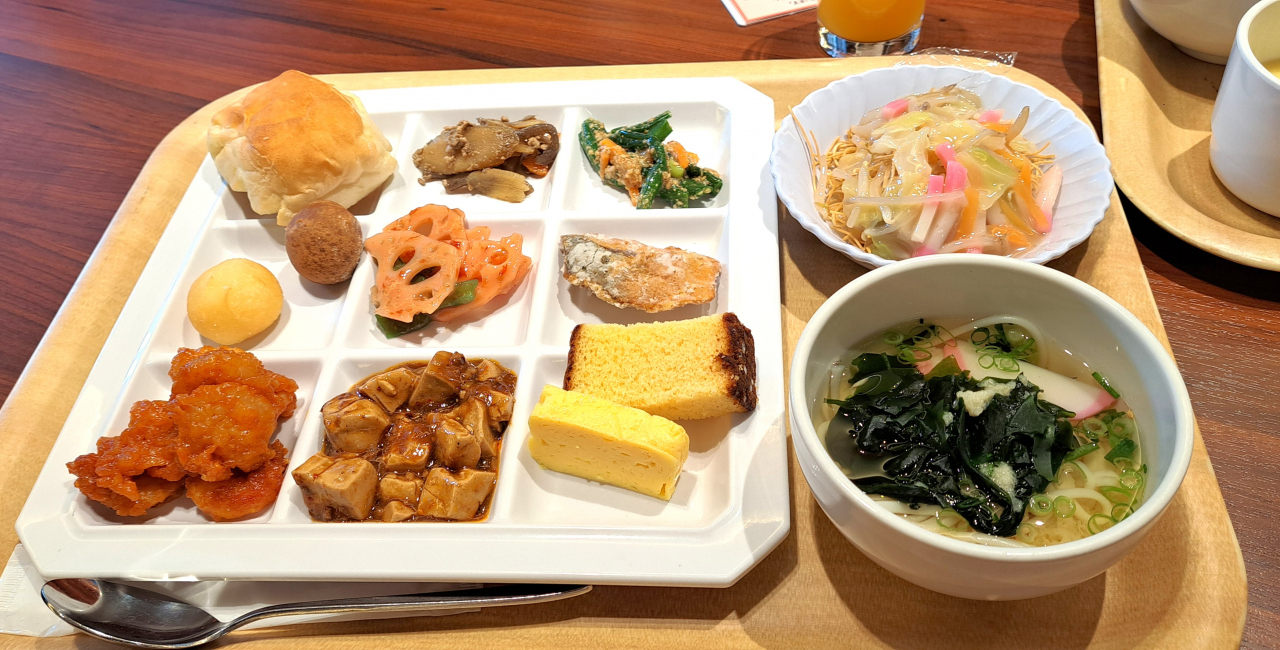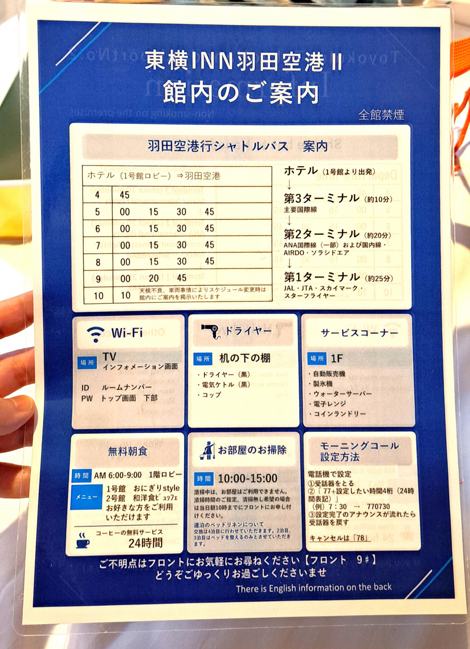 空港行きのリムジンバスは東横インⅠの前、4時45分からあり朝早い便でも対応しています。ⅡからⅠへの移動は細い道を渡るので完全にバリアフリーではありませんが問題ありませんでした。朝食は6時からですが5時にはパンとコーヒーが食べられます。