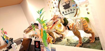 最初入るのに勇気がいりましたが、フロントで頑張っている恐竜たちが次第にかわいく思えてきました。丁度七夕の頃で織り姫と彦星の格好をしていました。画面でタッチしてチェックインしますが分からなくなったら人を呼べるので心配いりません。