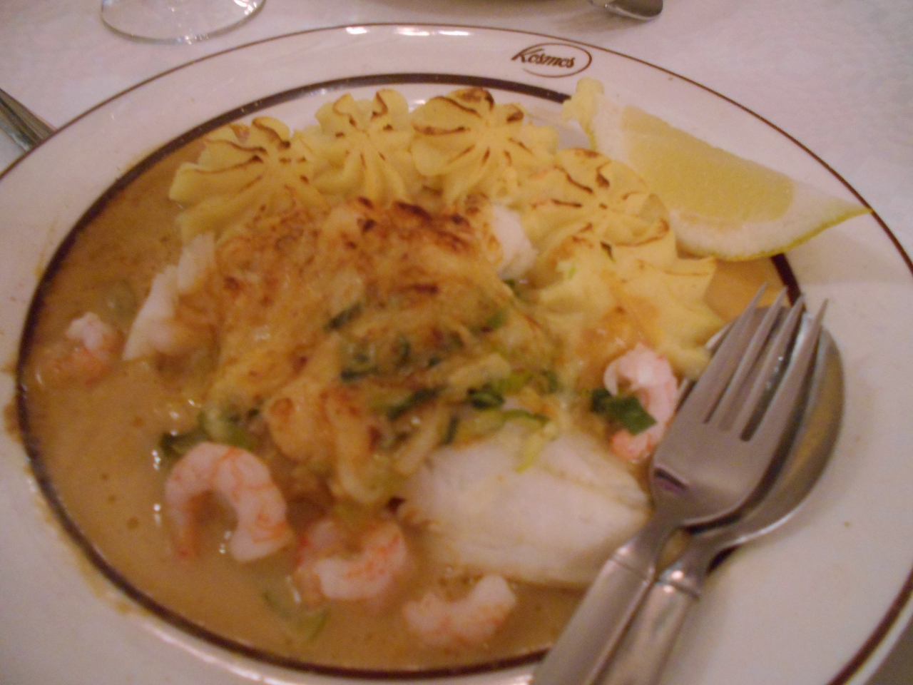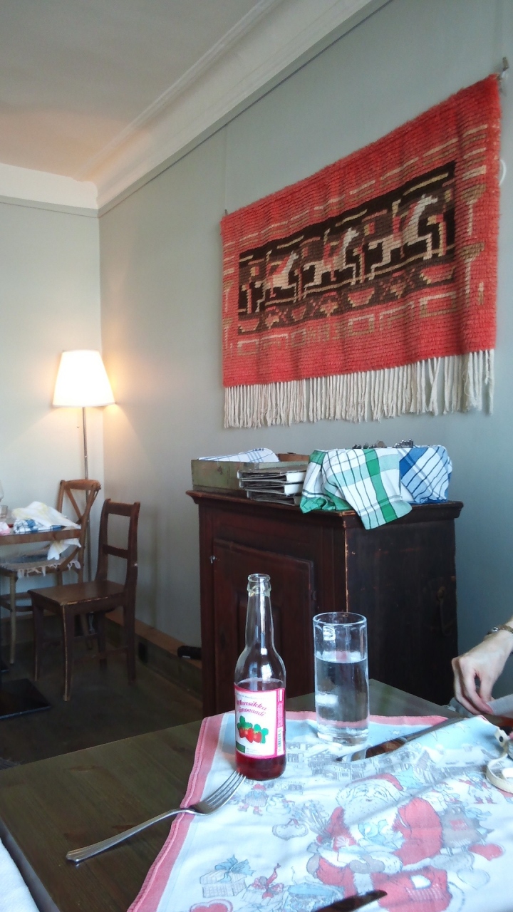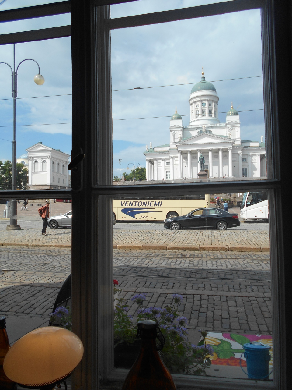 フィンランドに来たらどうしてもトナカイが食べたくて「ポロンリハ (トナカイ肉)」という単語を覚えていったほど。あまりお腹が減ってなかったので半分ずつ。子トナカイのクランベリーソースと色々なものが少しずつのっている1品。多分おさけを飲みながらだともっとおいしいのでしょう。食器は木製のものもありますがお皿などはアラビアで統一されています。窓際に席が取れたら文句なしです。目の前にヘルシンキ大聖堂が見えます。アレクサンドル2世の銅像の頭にカモメがとまっているのもよくわかります。カモメはなぜか銅像のてっぺんに必ずいます。 歴史を感じさせる店内ですが、お手洗いは近代的で入ると自然と電気がついて出ると消えます。一人のみもの付きで18.50ユーロ。