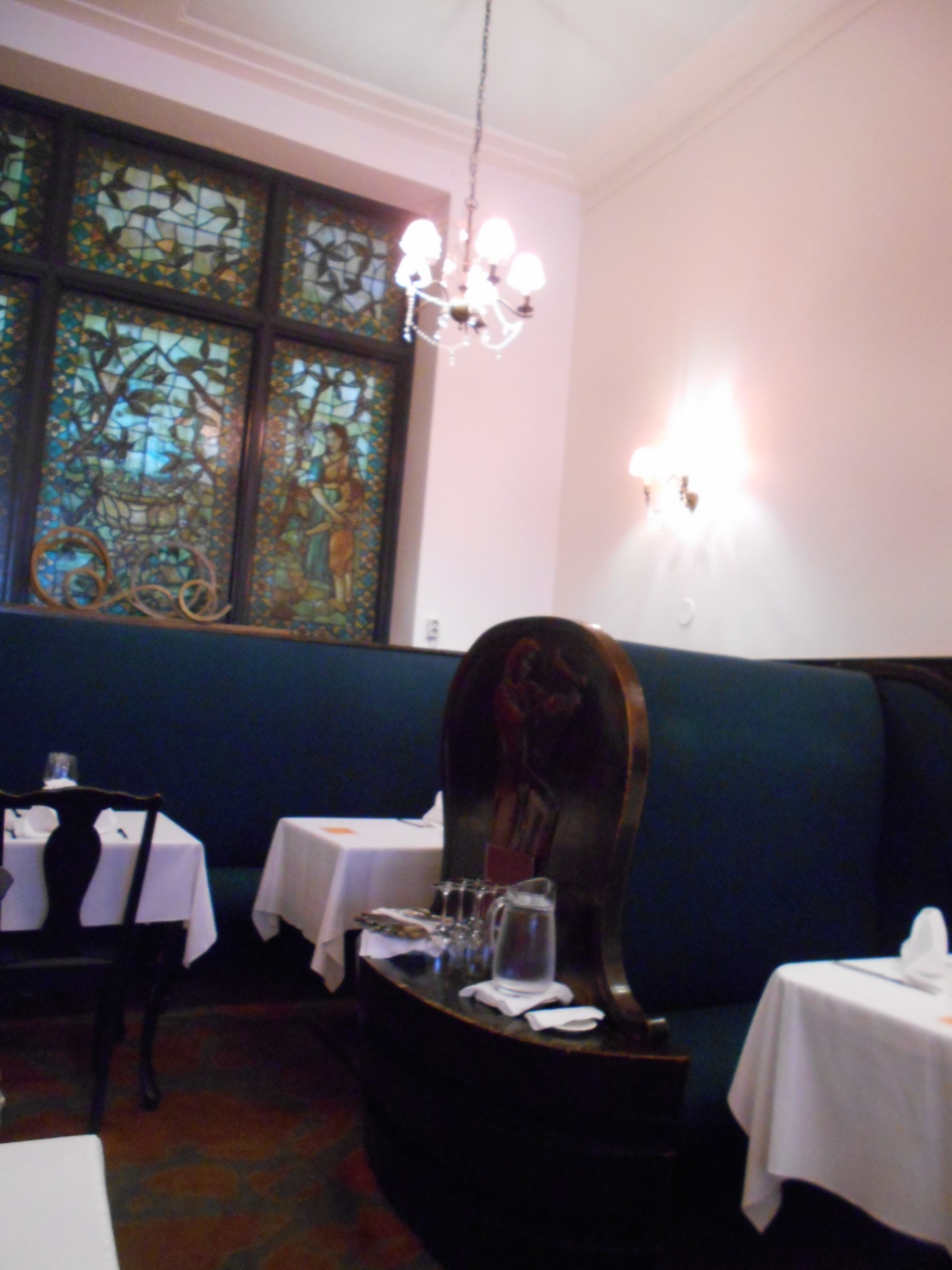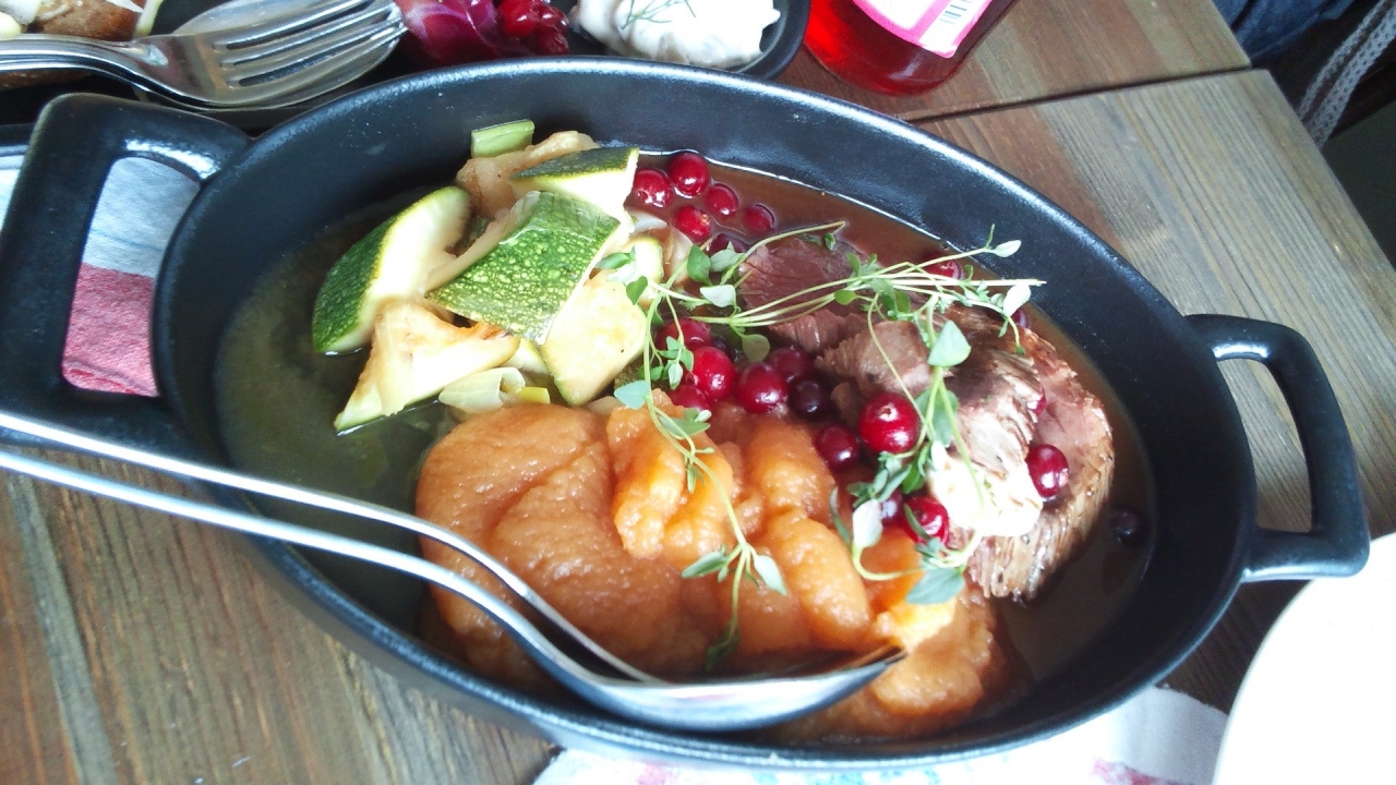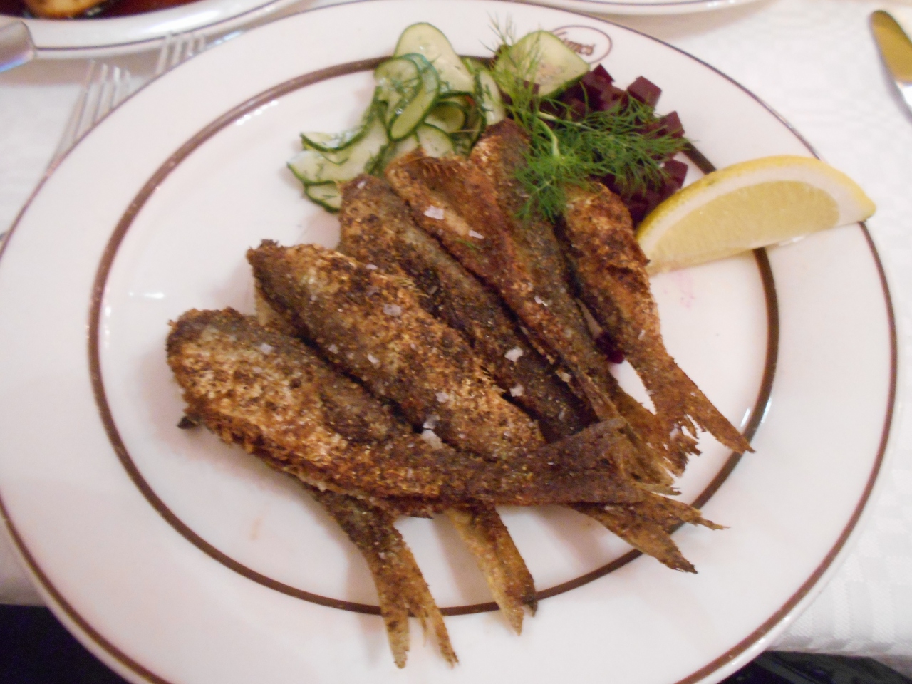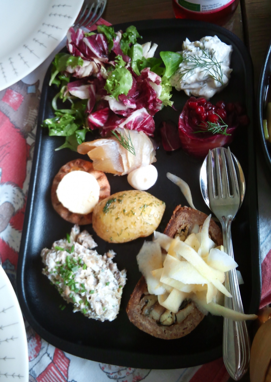 フィンランドに来たらどうしてもトナカイが食べたくて「ポロンリハ (トナカイ肉)」という単語を覚えていったほど。あまりお腹が減ってなかったので半分ずつ。子トナカイのクランベリーソースと色々なものが少しずつのっている1品。多分おさけを飲みながらだともっとおいしいのでしょう。食器は木製のものもありますがお皿などはアラビアで統一されています。窓際に席が取れたら文句なしです。目の前にヘルシンキ大聖堂が見えます。アレクサンドル2世の銅像の頭にカモメがとまっているのもよくわかります。カモメはなぜか銅像のてっぺんに必ずいます。 歴史を感じさせる店内ですが、お手洗いは近代的で入ると自然と電気がついて出ると消えます。一人のみもの付きで18.50ユーロ。