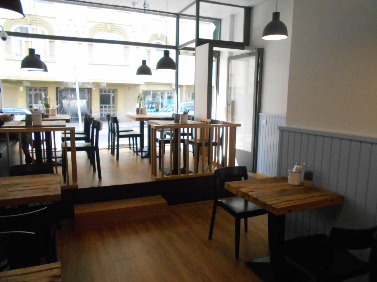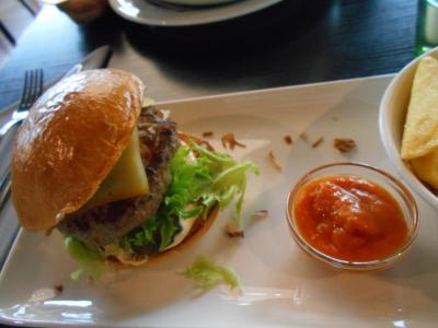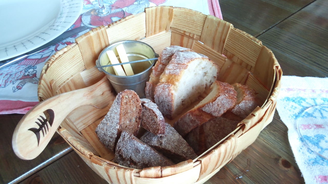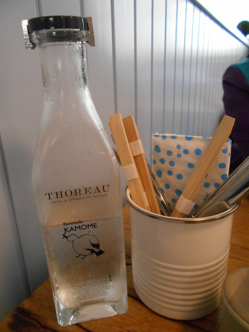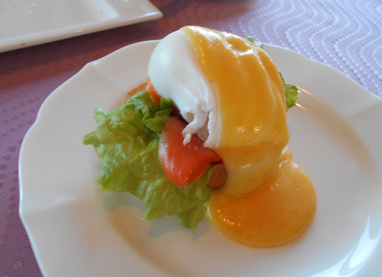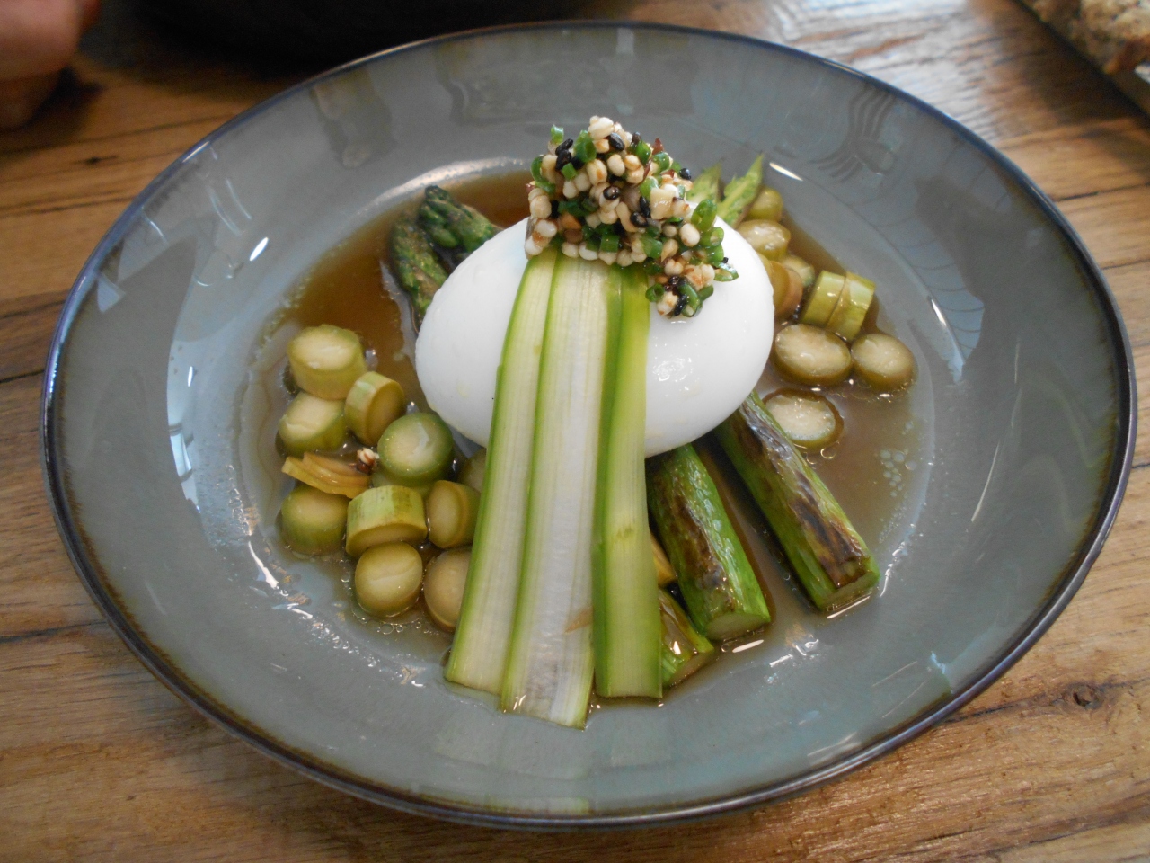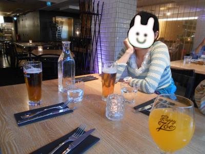 店内は薄い水色で料理と共に運ばれてくる炭酸水のボトルや紙ナプキンに可愛い太っちょカモメの絵がついてます。温泉卵ののったアスパラのサラダ9.50ユーロ、サーモン23ユーロ、ミートボール17.50ユーロでした。付いてきたパンのようなものがとてもおいしかったです。