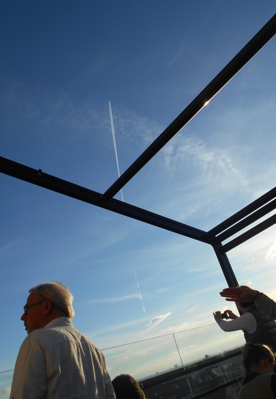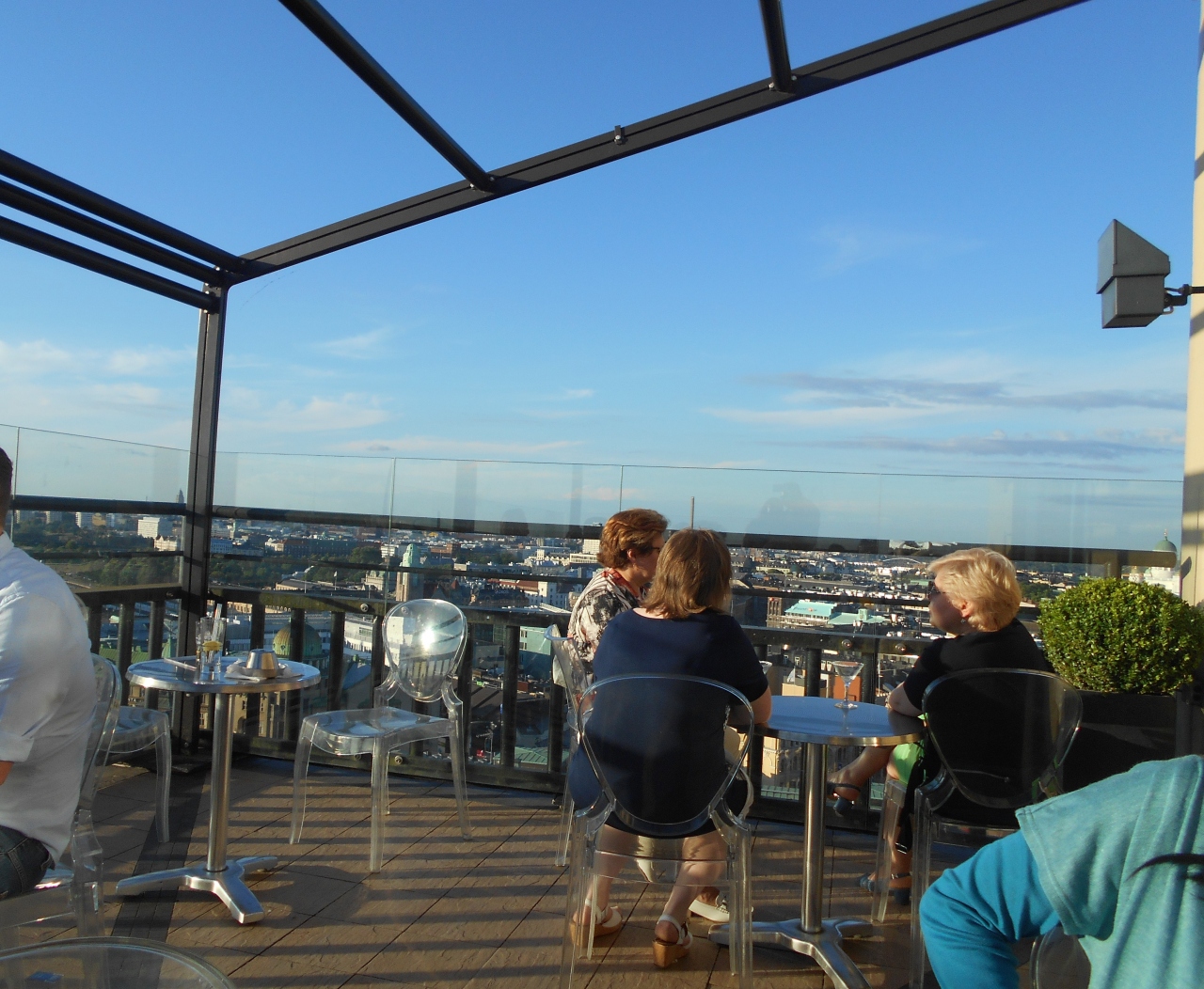 ソコス ホテル トルニ に泊まってるんだからいかない手はない。平日なら少しはすいてるのではないかと夜の8時半頃14階まで上がりました。まだ日は沈まず真上に伸びる飛行機雲や気球を見ながらドリンクをいただきました。 天気がいいとはいえ日本人の私たちにとって屋上の風は冷たく感じました。でもひざ掛けのような毛布もおいてありましたよ。たくさんの人があふれかえっていて席がなくても立ったまま飲んでいる人たちもいました。よほど人気のあるスポットなのでしょうが結構回転はよく少し待つと座れました。真ん中がバーカウンターのように飲み物を受け取るところでカウンターの周りに室内席があります。ここもガラス張りなので景色は見えます。両側にオープンの席がありどちらに座るかで見える景色は違います。1階下のお手洗いもガラス張りです!ここより高い建物が近くにないのでOKなのでしょうね。ソフトドリンクなら5.30ユーロ。カクテルは10~20ユーロくらいです。