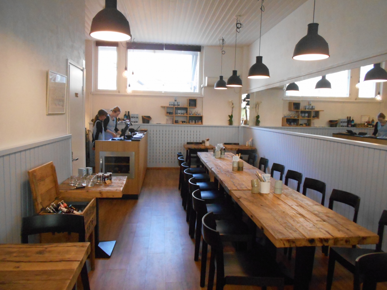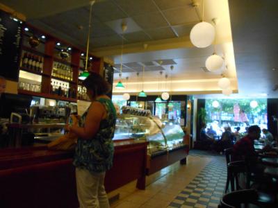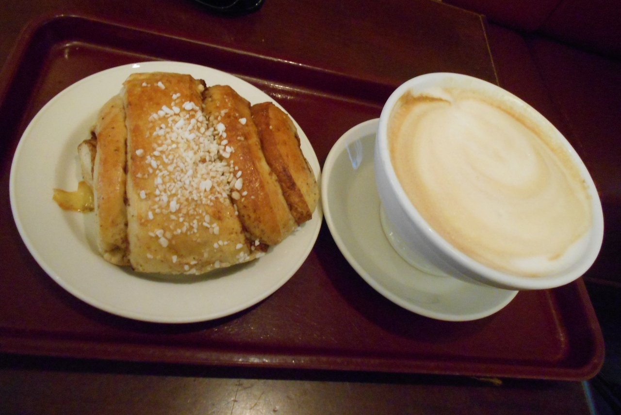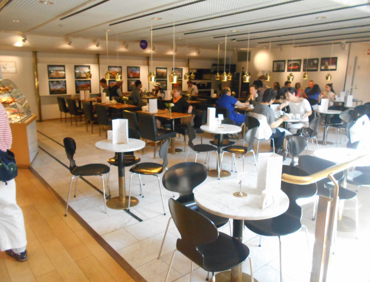 表のテラス席はいっぱいでしたが、店内はすいているのでは?と覗いたら大当たりでした。北欧の人は私達日本人では考えられないくらい太陽が大好き。2時半という暑~い時間帯にも皆テラス席が好き。店内は涼しく通路も広め。奥の方まで席があるのにガラガラ状態。半分セルフサービスのようでお砂糖などは自分たちでとります。ショーウインドのシナモンロールを指さしでゲット。もちもちで個人的には好みのタイプ。3.90ユーロとお安いのもうれしい。カフェオレはほとんど3人分くらいあってボウルからこぼれそうでした。こちらは4.60ユーロ。