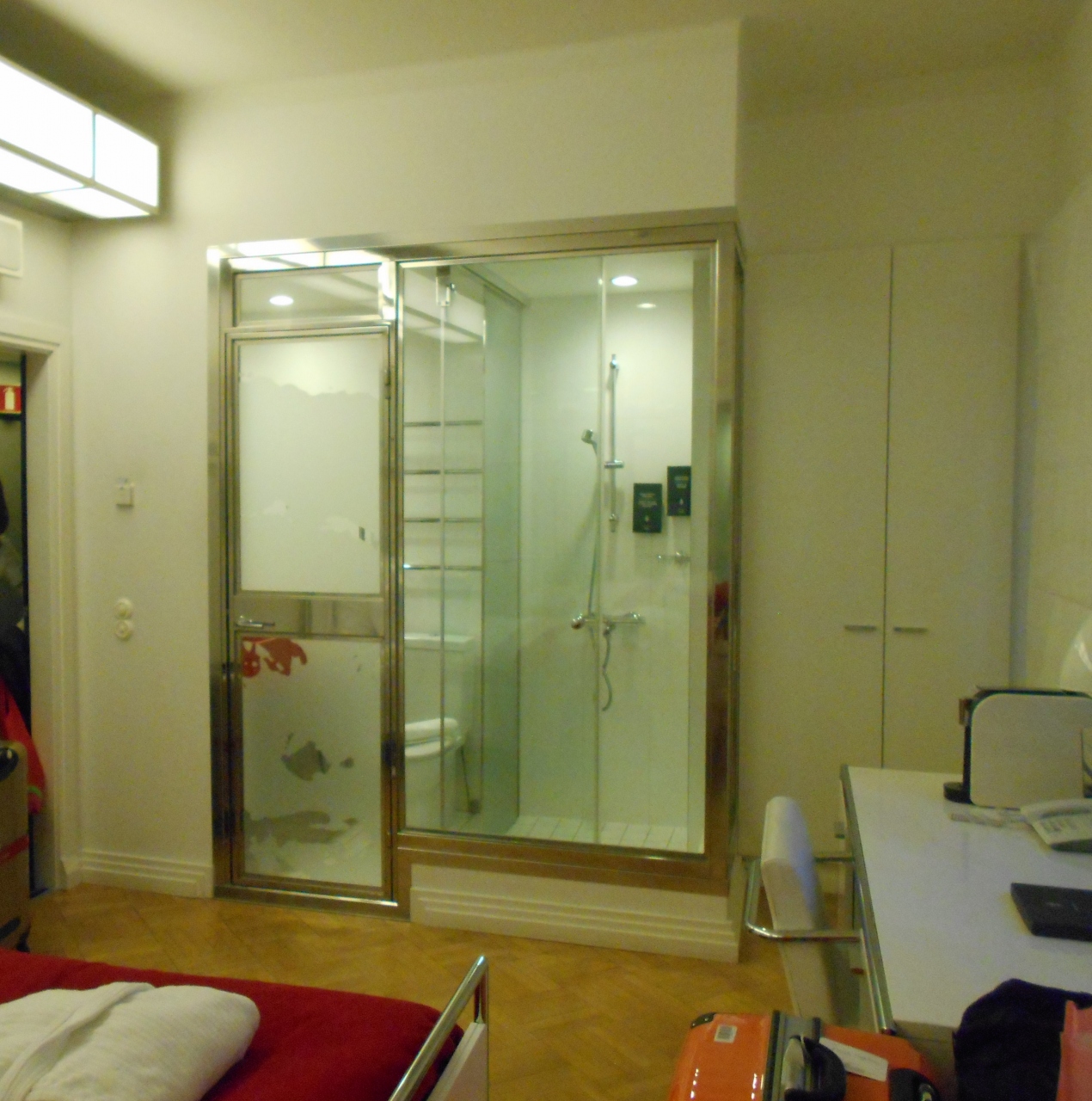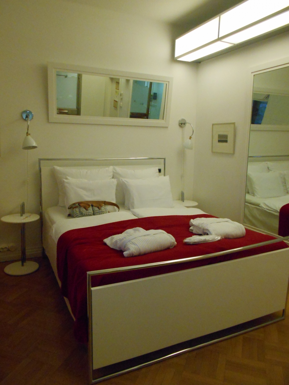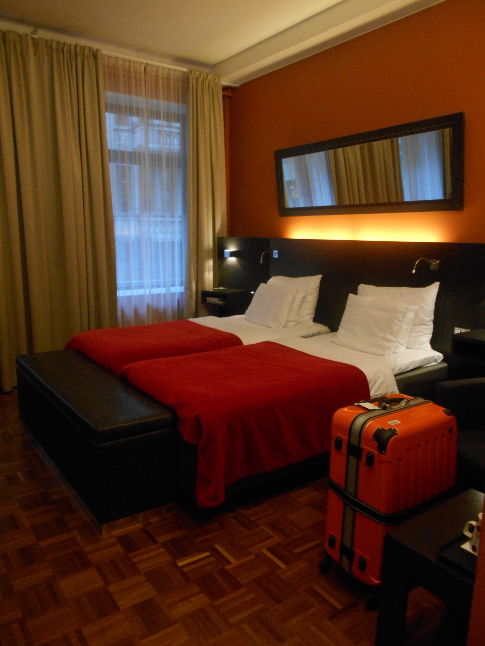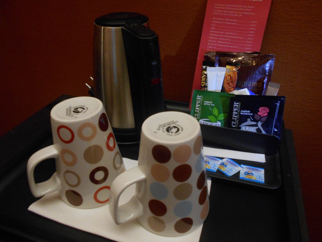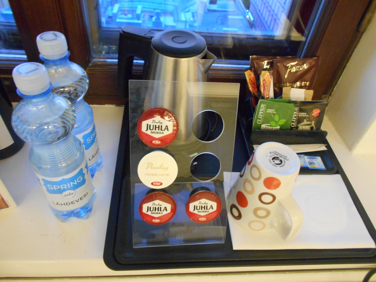 まずヘルシンキ1日目、1階の奥のツインに泊まりました。海外ではほとんど期待していないポットやコーヒー、お茶のセットがあって嬉しくなりました。アイロンもありクローゼットも広くてよかったです。外は斜めになった通りを見られてこれはこれでよかったです。